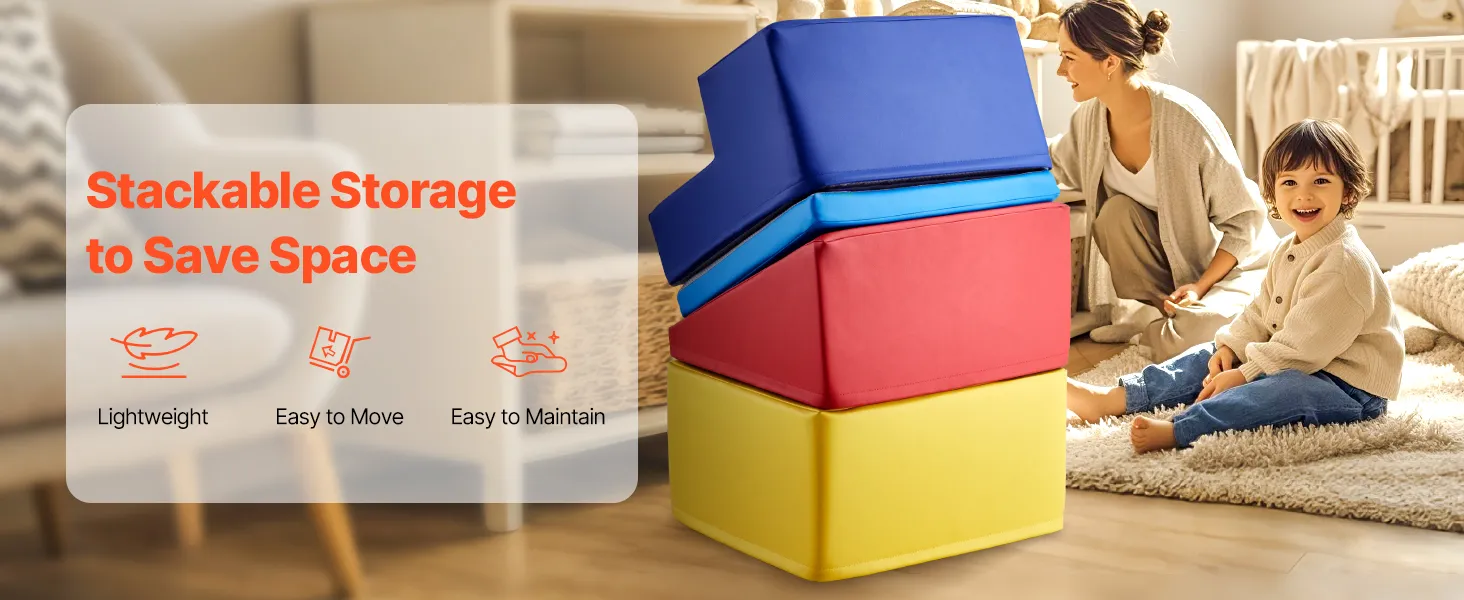 Easy to Clean and Store: The soft, breathable PU fabric provides excellent waterproof and stain-resistant properties. Simply wipe away dust and stains with a damp cloth (avoid bleach). The lightweight design of the soft climbing blocks allows the blocks to be stacked and stored away, saving space when not in use.