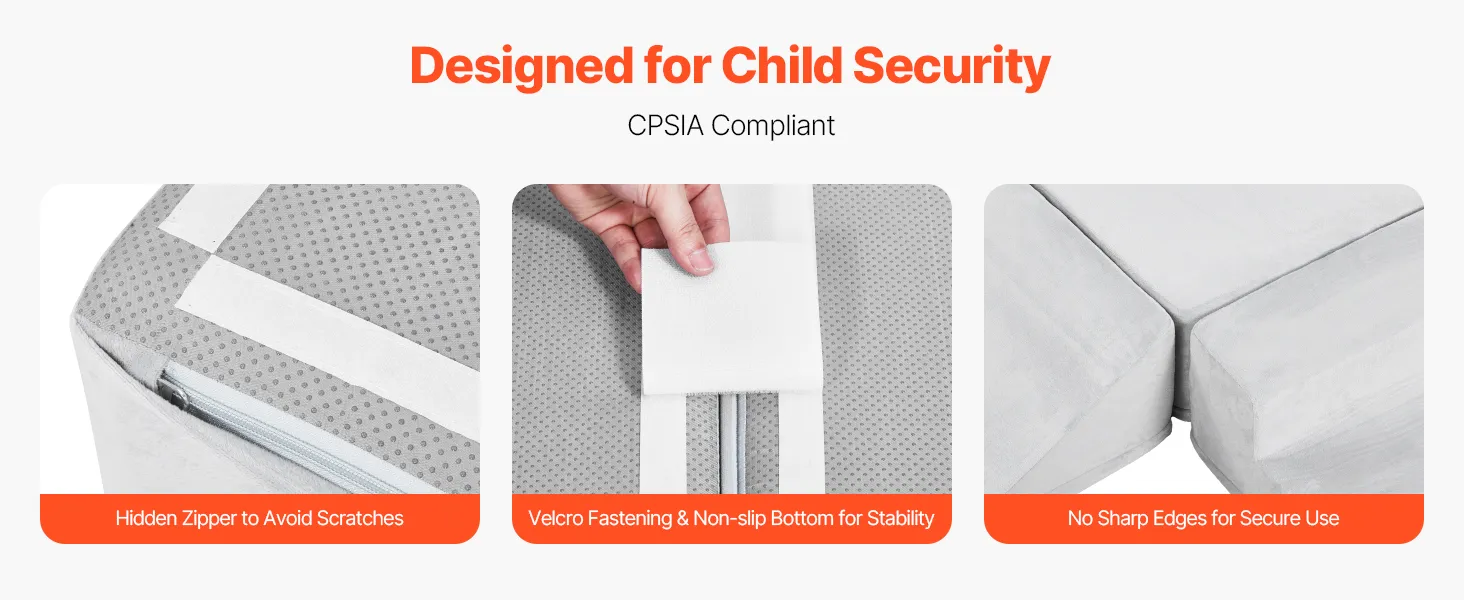 Child Security First: Compliant with U.S. CPSIA standards, the toddler foam climbing blocks are made with secure materials, low VOC, and do not release harmful chemicals, ensuring your child's security and health while playing. The foam blocks have no sharp edges and feature hidden zippers to secure delicate skin.