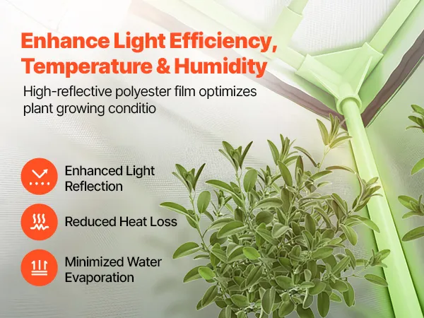 De plantentent voor binnen is voorzien van sterk reflecterende polyesterfolie, die de lichtreflectie maximaliseert en zo energieverspilling vermindert. Het minimaliseert ook warmteverlies en zorgt voor een stabiele binnentemperatuur in koude gebieden. De afsluitende eigenschappen van de folie helpen de luchtvochtigheid te behouden en verminderen waterverdamping.