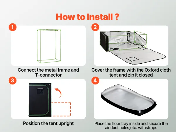 Eenvoudige montage. Verbind het metalen frame met de T-connectoren, bedek het frame met de Oxford-tentstof en sluit de ritsen. Bevestig tot slot het kijkvenster, de ventilatieopeningen en andere onderdelen met de banden om de montage te voltooien.