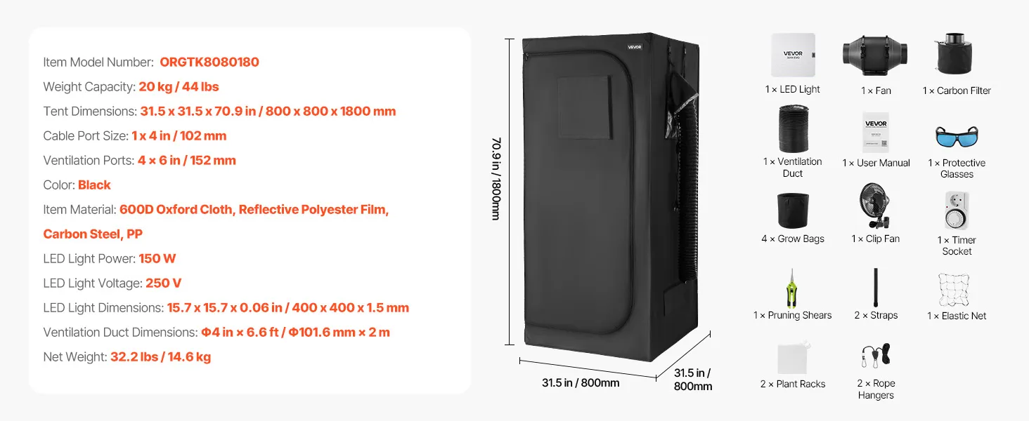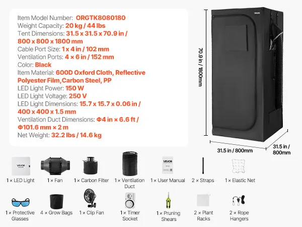 Complete kweektentset: een complete set, ideaal voor beginners die snel aan de slag willen. Inclusief een led-kweeklamp, een klemventilator, een kanaalventilator, een ventilatieslang, een koolstoffilter, een timer, een temperatuur- en vochtigheidsmeter, evenals plantenzakken, een schaar, glazen potten en andere accessoires. De kweektent voor binnen is voorzien van efficiënt kabel- en kanaalbeheer voor een eenvoudige installatie.