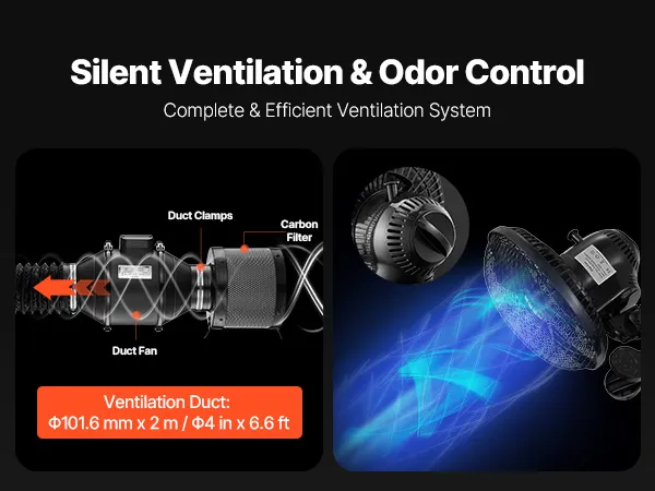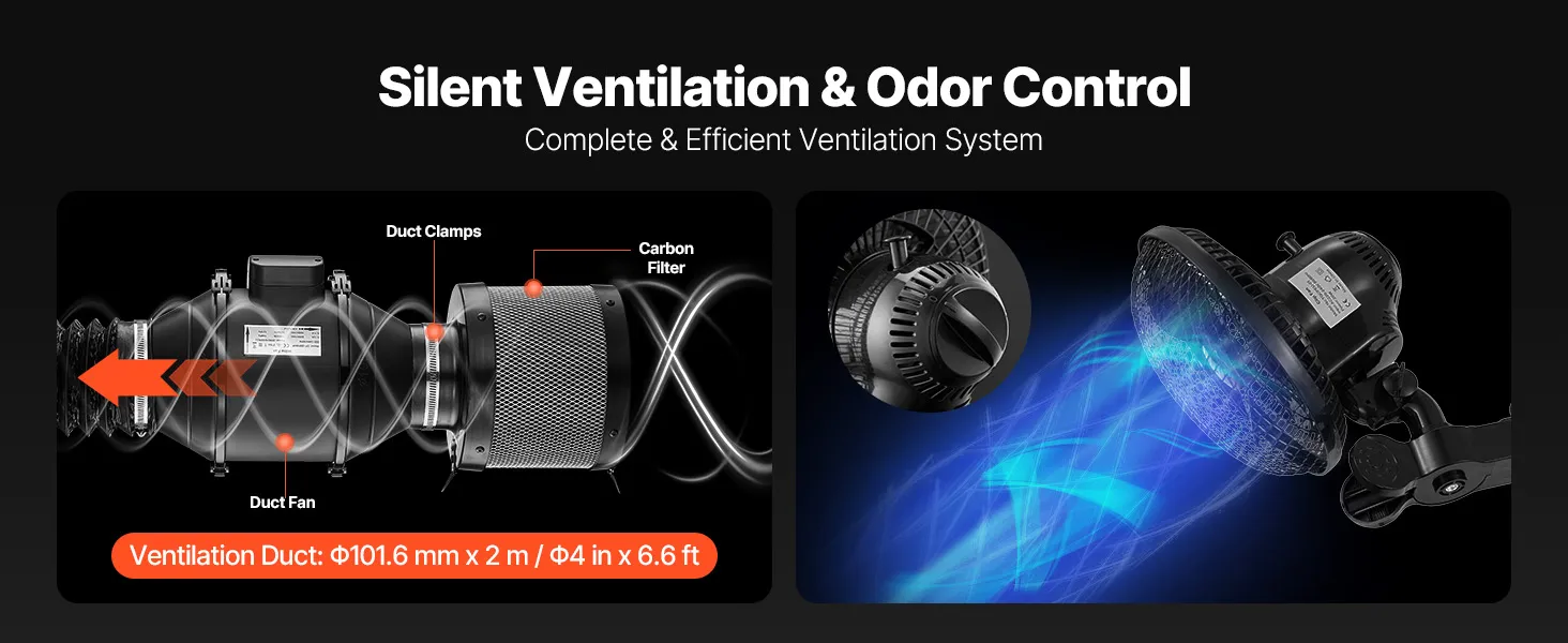 Efficiënt ventilatiesysteem: Uitgerust met een krachtige kanaalventilator met een luchtstroom van 198 m³/u en een stille werking. In combinatie met een koolstoffilter en een 2 meter lange flexibele uitlaatpijp zorgt onze kweektent voor kamerplanten voor optimale ventilatie, filtert stof en elimineert geurtjes, waardoor de omgeving optimaal blijft voor de gezondheid van de planten.