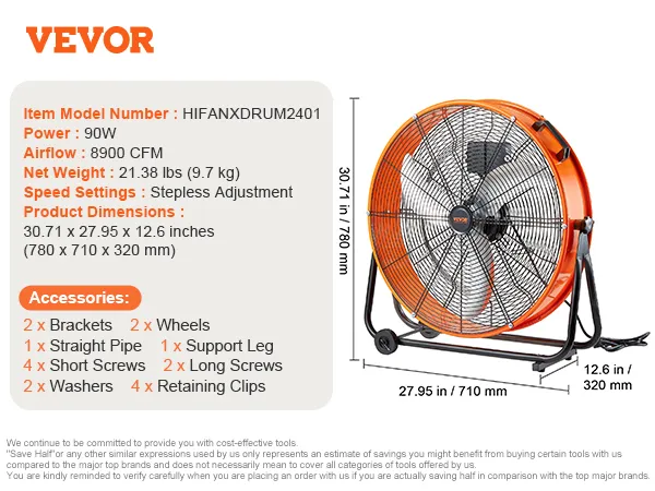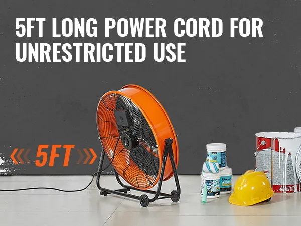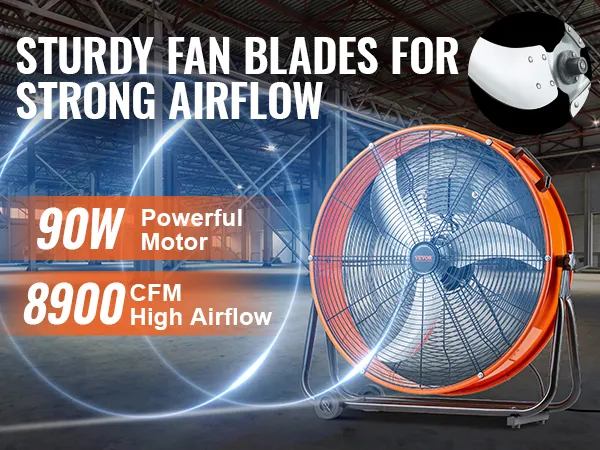Sterke luchtstroom: de hoogwaardige motor levert consistent een sterke luchtstroom met een maximaal vermogen van 8900 CFM, waardoor een effectieve ventilatie van elke omgeving wordt gegarandeerd. Deze industriële vloerventilator kan probleemloos stof verwijderen, koelen en lucht verversen.