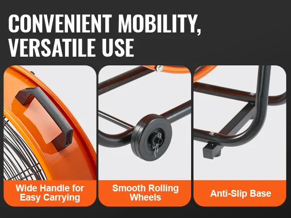 Gemakkelijke mobiliteit: deze ventilator is uitgerust met een brede handgreep voor transport met één hand en is gemakkelijk te verplaatsen. Soepel rollende wielen maken het gemakkelijk om over gladde oppervlakken of oneffen terrein te manoeuvreren, zodat uw ventilatiebehoeften altijd binnen handbereik zijn.