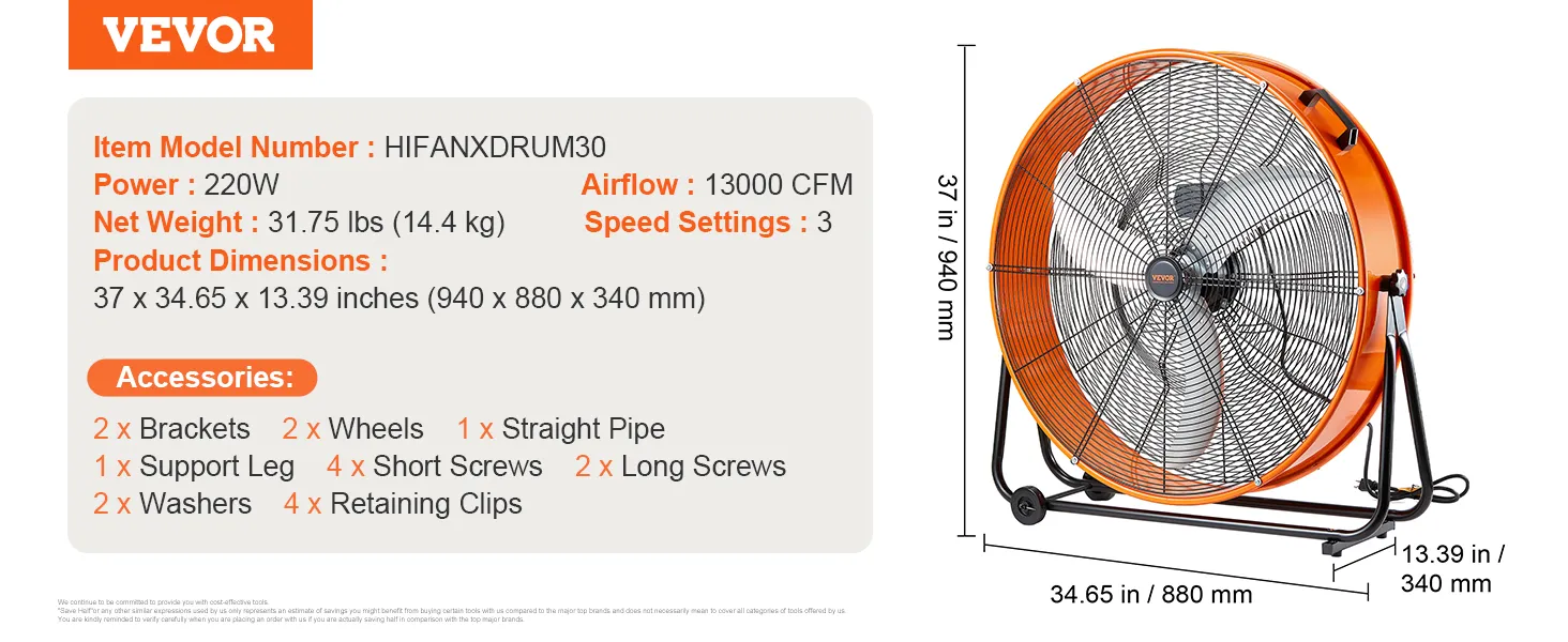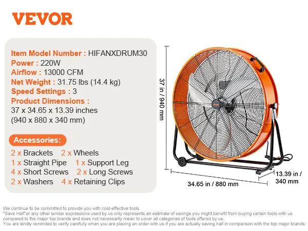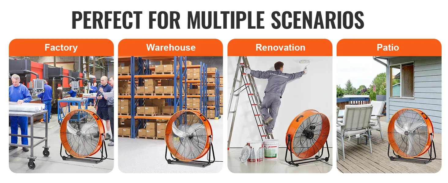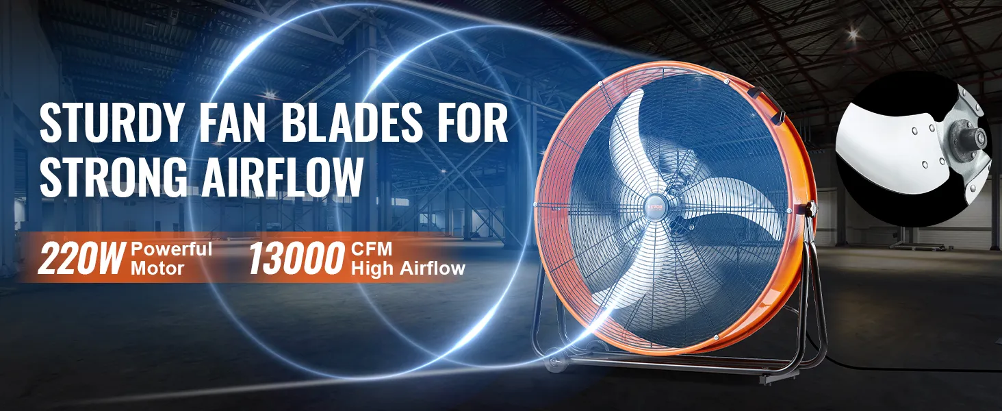 The VEVOR industrial fan features a high-quality motor that delivers powerful airflow for efficient ventilation. Its specialized blade design enhances air movement, ensuring strong and stable airflow for a fresh and comfortable work environment.