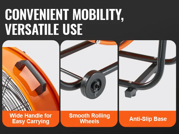 Easy Mobility: Designed with a wide handle for single-handed transport, this fan is easy to move. Smooth-rolling casters make it effortless to navigate across smooth surfaces or rough terrain, ensuring your ventilation needs are always within reach.