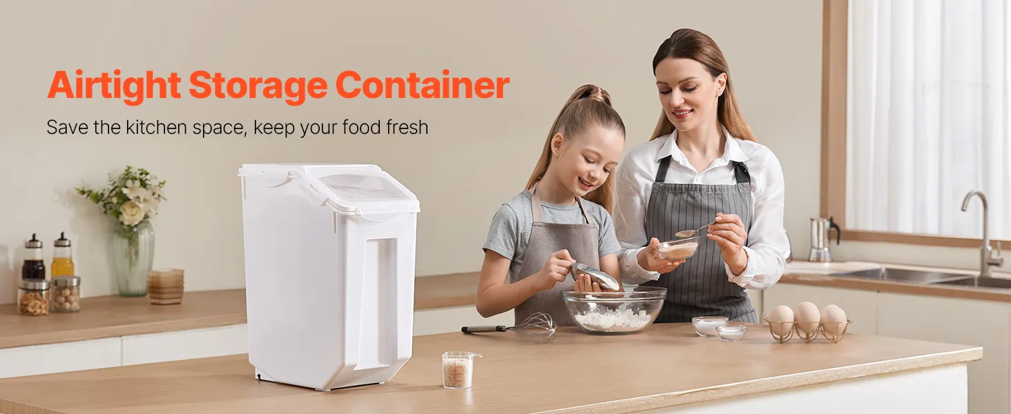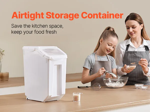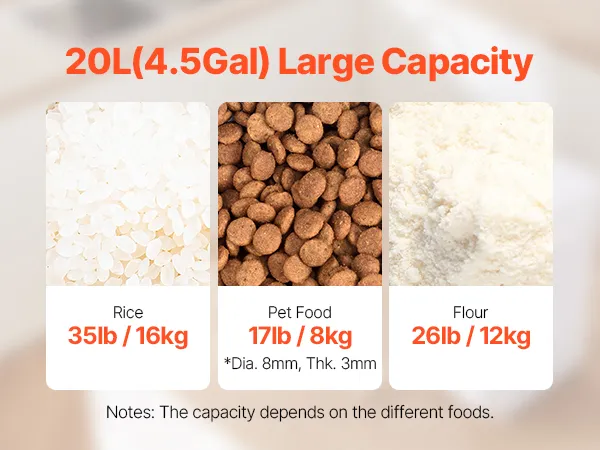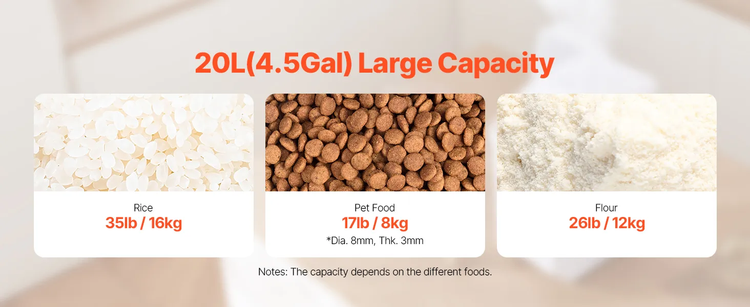Extra groot en ruimtebesparend: Maximaliseer uw opslagruimte met deze rijstopslagcontainer! Afhankelijk van de grootte en dichtheid van uw droogvoer kan er ongeveer 15,88 kg rijst of 7,71 kg huisdiervoer in. Let op: De capaciteit varieert afhankelijk van de grootte, vorm en dichtheid van uw droogvoer.