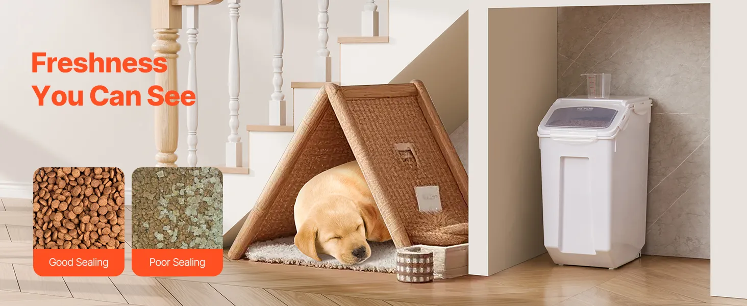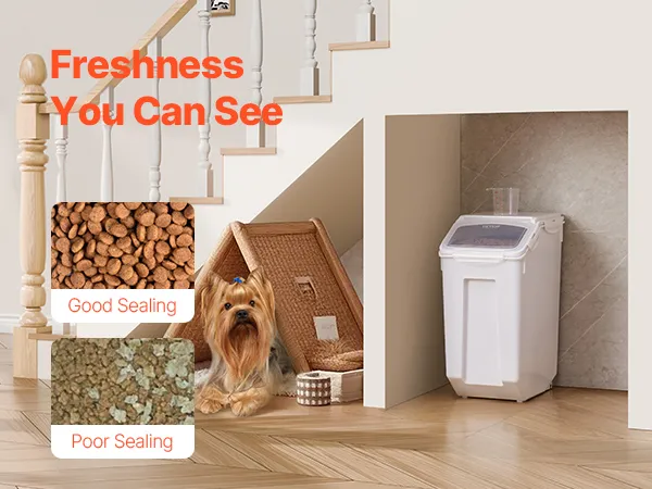 100% luchtdicht ontwerp: houd uw voedsel vers en beschermd met de luchtdichte dubbele siliconenafdichting, vochtbestendige doos en veilige grendels. Deze voedselcontainer voor huisdieren is perfect om vocht en vliegen buiten te houden, waardoor hij ideaal is voor het bewaren van droogvoer.