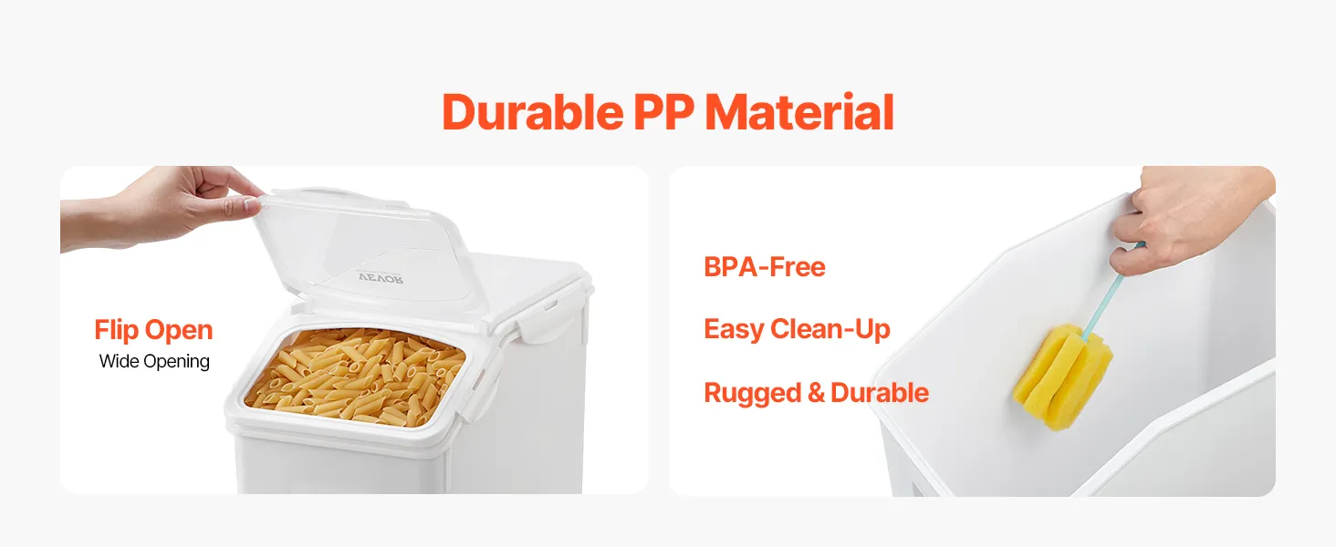 PP-materiaal van voedingskwaliteit: deze hondenvoercontainer is gemaakt van BPA-vrij, niet-giftig PP-materiaal van voedingskwaliteit, dat niet alleen duurzaam is, maar ook veilig voor het bewaren van voedsel voor huisdieren en mensen. Het is ook gemakkelijk schoon te maken.