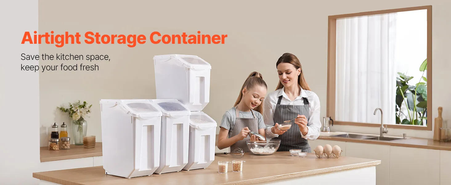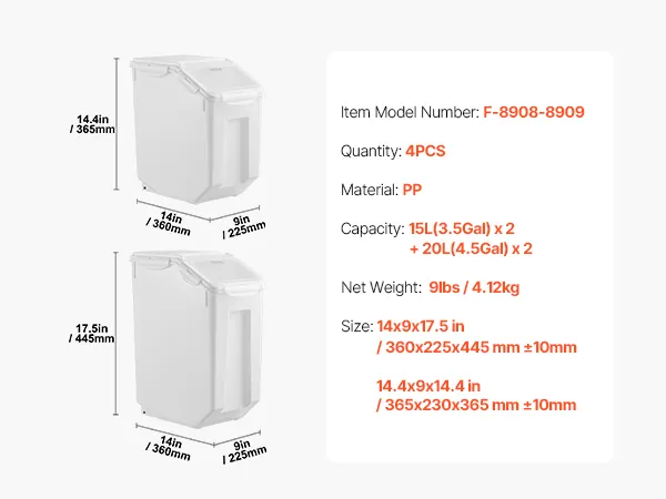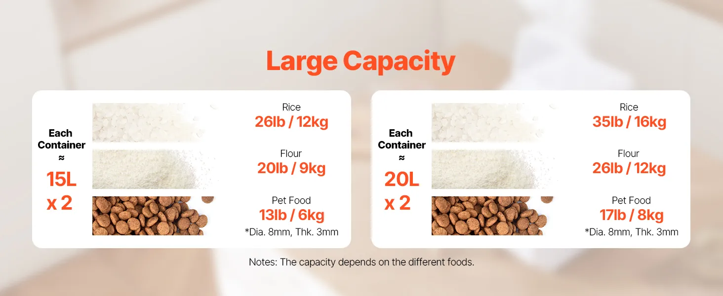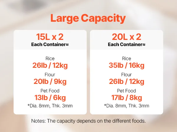 Extra groot en ruimtebesparend: Maximaliseer uw opslagruimte met deze rijstopslagcontainer! Afhankelijk van de grootte en dichtheid van uw droogvoer kan de container van 15 liter maximaal 11,79 kg rijst of 5,9 kg huisdiervoer bevatten; De container van 20 liter kan maximaal 15,88 kg rijst of 7,71 kg veevoer bevatten. Let op: De capaciteit varieert afhankelijk van de grootte, vorm en dichtheid van uw droogvoer.
