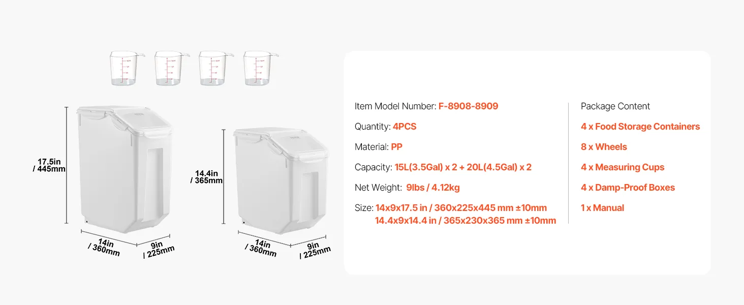 VEVOR Rijstbewaarcontainers Hondenvoerdispenser 4 stuks 2 x 15 L / /20 L x 2 Containers voor Keuken Ingrediënten Granen, Huisdiervoercontainer met Wielen Maatbeker Luchtdichte Deksel