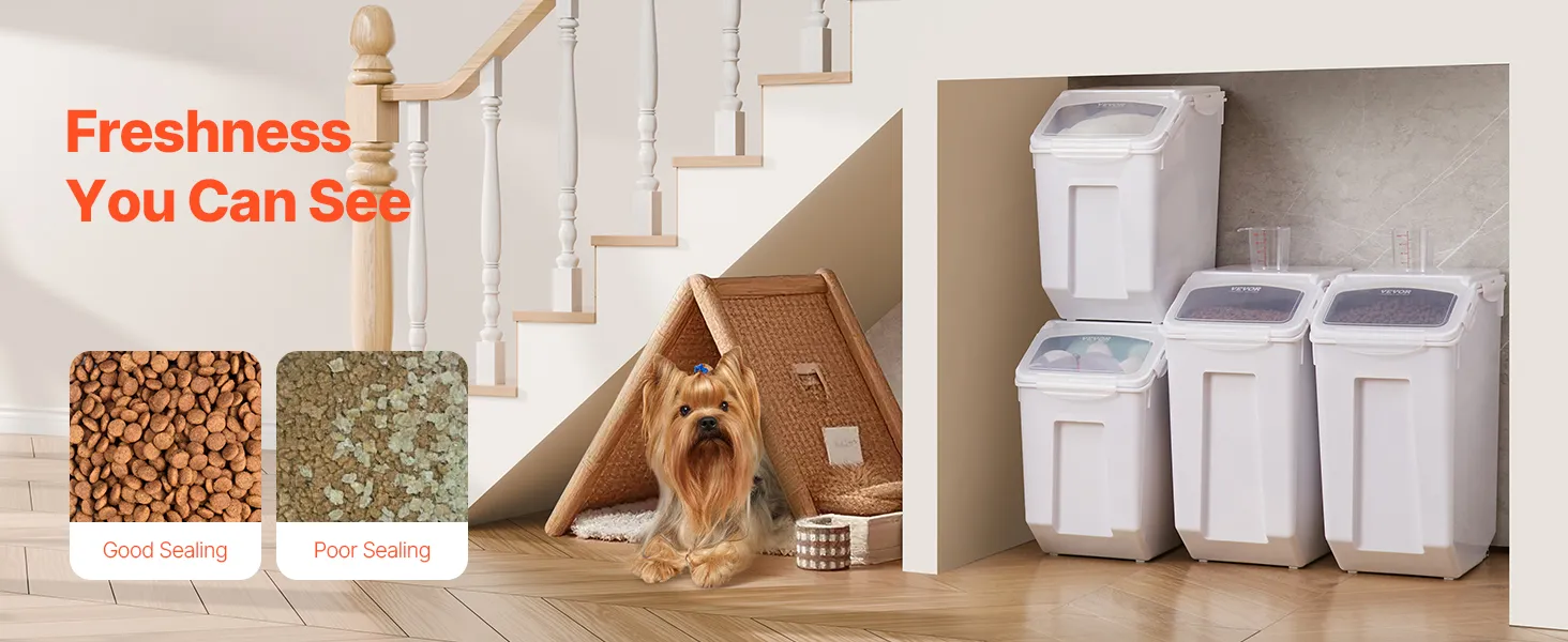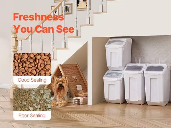 100% luchtdicht ontwerp: houd uw voedsel vers en beschermd met de luchtdichte dubbele siliconenafdichting, vochtbestendige doos en veilige grendels. Deze voedselcontainer voor huisdieren is perfect om vocht en vliegen weg te houden, waardoor hij ideaal is voor het bewaren van droogvoer.