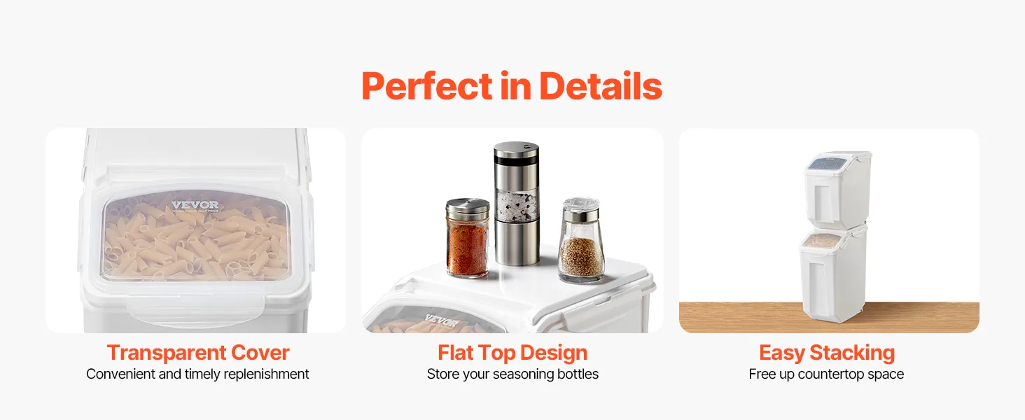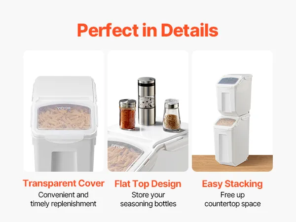 Zichtbaar deksel en wielen: dankzij het doorzichtige deksel kunt u snel controleren hoeveel voedsel er nog over is. De kattenvoercontainer beschikt ook over universele, afneembare wielen voor gemakkelijke mobiliteit. Je kunt je kruidenflessen ook op de platte bovenkant bewaren en containers verticaal stapelen om ruimte te besparen.