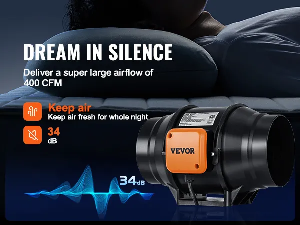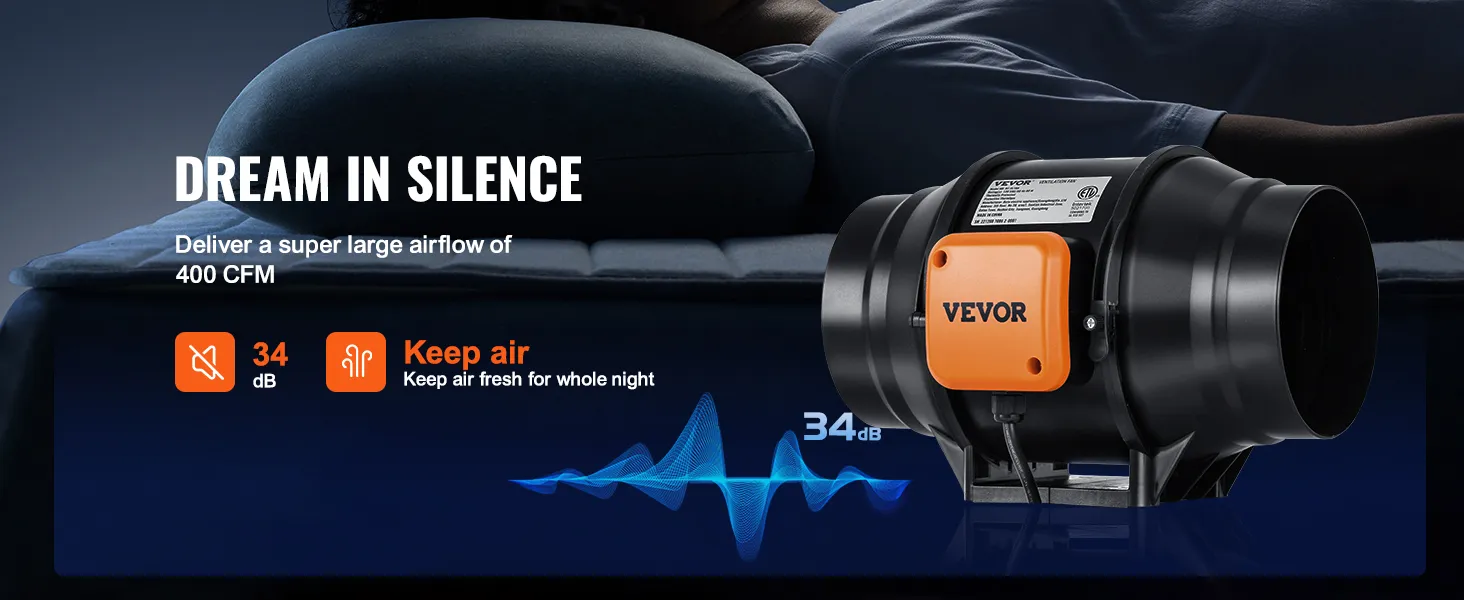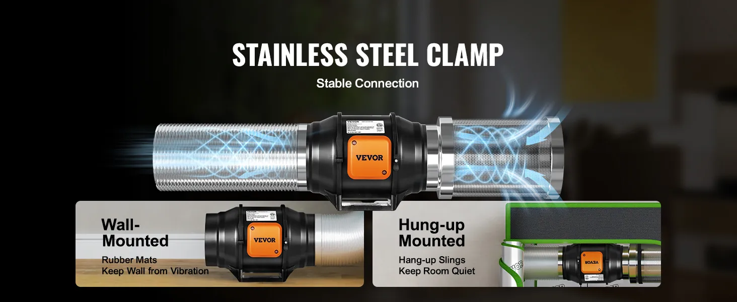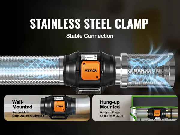 De VEVOR inline kanaalventilator is uitgerust met een snelle motor van puur koper die een groot luchtvolume levert om voor voldoende ventilatie te zorgen. Het heeft trillingsvrije rubberen matten om het geluid te verminderen.