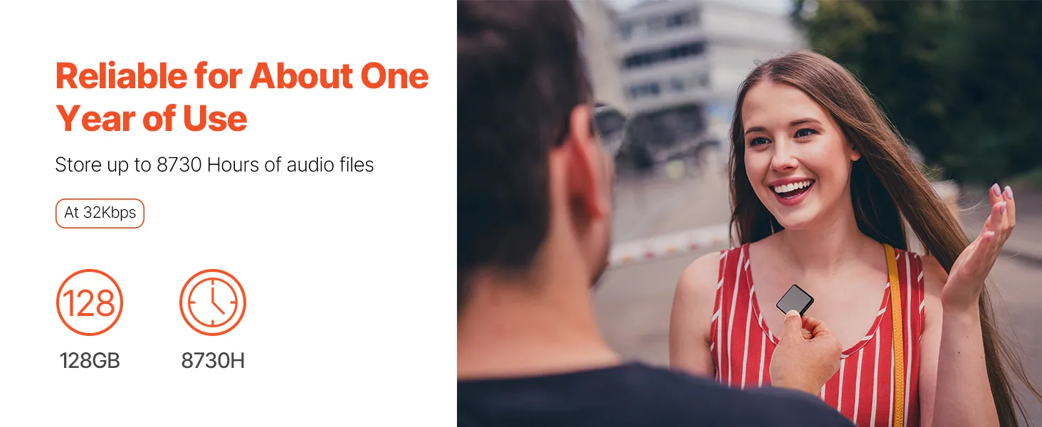 This digital voice recorder comes with 128GB built-in memory, capable of storing up to 8,730 hours of recordings at 32Kbps. That's about one full year of audio! Say goodbye to the hassle of frequent backups. Suitable for students, professors, and journalists.