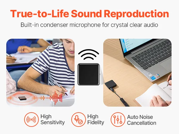 Excellent Noise Cancellation: Experience crystal-clear audio with a default noise reduction function in offices, classrooms, or meetings. The portable audio recording device picks up sound with high-definition clarity from up to 5 meters within a 180-degree range
