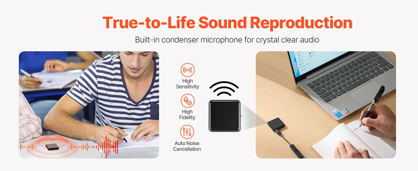 The audio recording device comes with a default noise cancellation feature, ensuring clear sound capture even in noisy surroundings. It effectively reduces background noise, allowing voices to come through loud and clear. You can focus on what's being said without distractions.