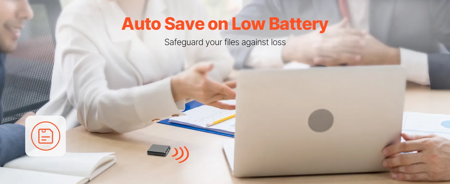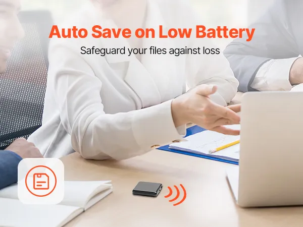 Auto Save on Low Battery: This mini portable voice activated recorder allows you to record continuously for up to 10 hours on a single charge. With smart battery detection, it automatically saves your files on low battery. Knowing your important audio is always protected