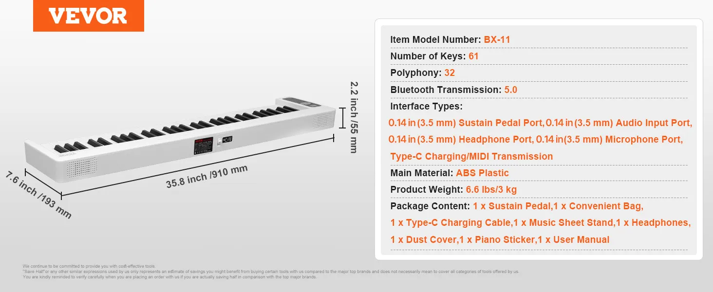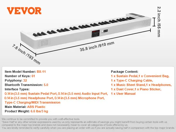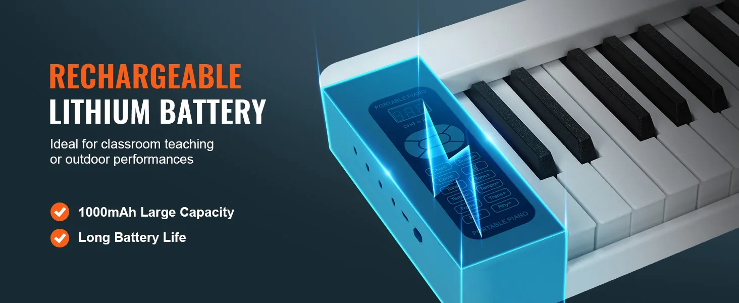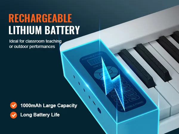 Ultradun en opvouwbaar ontwerp: ons draagbare pianotoetsenbord met 61 toetsen heeft een ultradunne behuizing en een 180° opvouwbaar lichtgewicht ontwerp, waardoor het ongelooflijk gemakkelijk op te bergen en te dragen is. Met een ingebouwde oplaadbare lithiumbatterij ondersteunt hij langdurig gebruik en is hij perfect om overal mee naartoe te nemen.