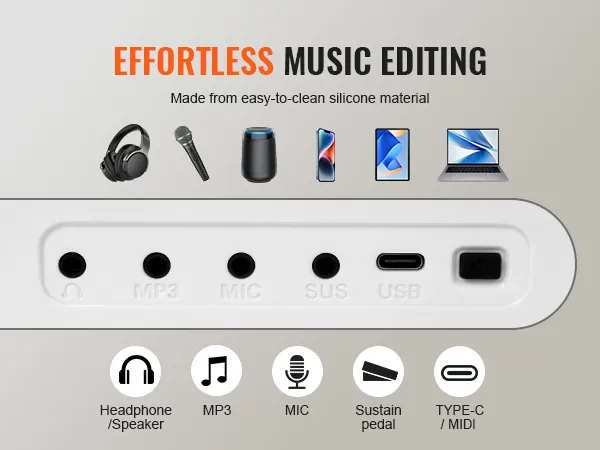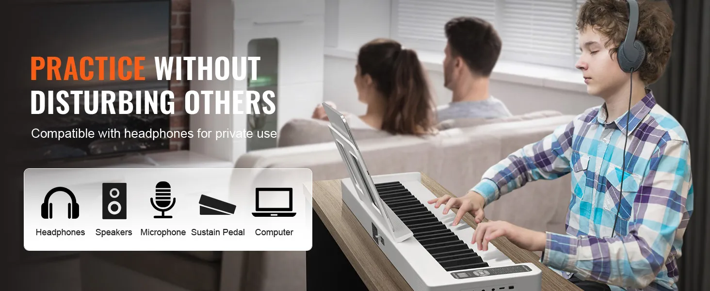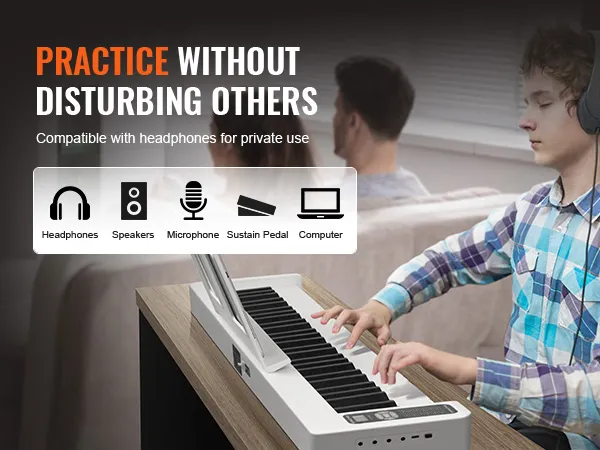 Dankzij de speciale koptelefoonaansluiting kun je oefenen met ons draagbare toetsenbord zonder anderen te storen. Bovendien kunt u dankzij de microfooningang meespelen en meezingen op een draagbaar pianotoetsenbord, waardoor uw sessies nog dynamischer en leuker worden.