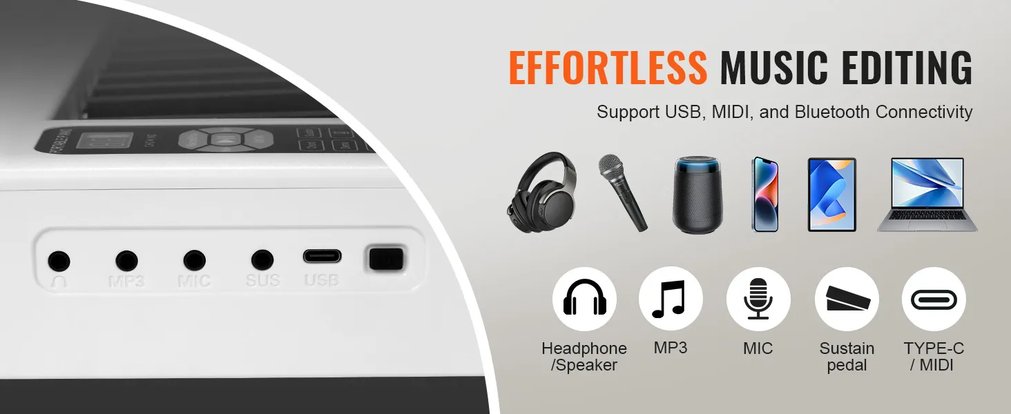 MIDI-functionaliteit en Bluetooth 5.0-connectiviteit: maak eenvoudig verbinding met uw apparaten om muziek naadloos te bewerken. Gebruik Bluetooth 5.0 om draadloos verbinding te maken met apps zoals Pop Piano en GarageBand om uw leer- en creatieve ervaring te verbeteren.