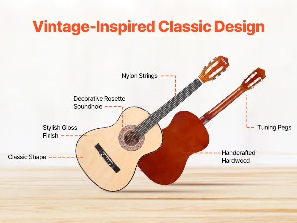 Klassiek retrodesign: Deze klassieke houten gitaar maakt indruk met zijn prachtig afgewerkte afwerking en strakke binding voor extra duurzaamheid en schokbestendigheid. Dankzij de smalle afstand tussen de snaren en de frets is hij geschikt voor beginners en vermindert hij vingervermoeidheid tijdens het spelen.