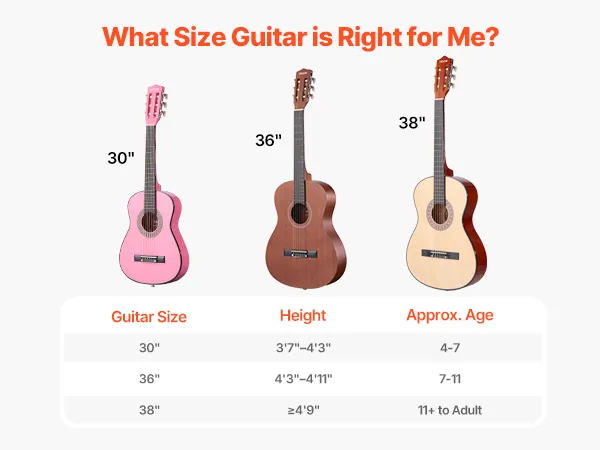 V: Is deze gitaar geschikt voor volwassenen of kinderen? A: Wij bieden klassieke gitaren aan in de maten 30", 36" en 38" voor spelers van alle leeftijden: 38" volledige maat: voor volwassenen en tieners vanaf 1,60 m. 36" maat: voor kinderen van 7 tot 11 jaar, 1,30 tot 1,40 m. 30" maat: voor jongere kinderen van 4 tot 7 jaar, 1,10 tot 1,30 m.