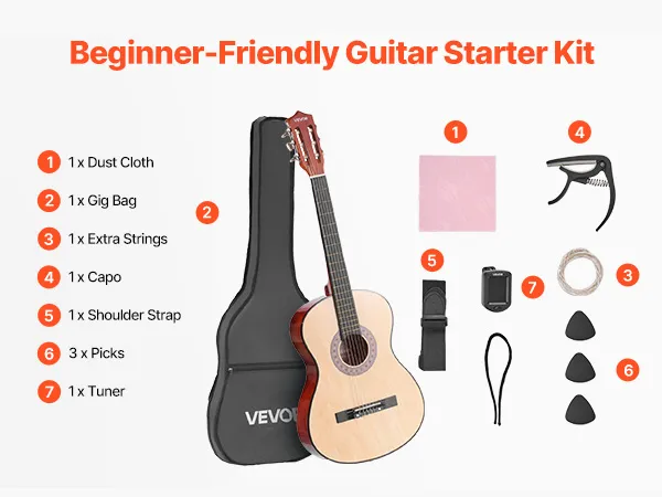 V: Wordt het geleverd met een tas, extra snaren of andere accessoires? A: Ja! Elke gitaar wordt geleverd met een complete beginnersset: gitaartas, stofdoek, reserve snaren, gitaarband, capo, digitale tuner en drie plectrums. Het is een complete beginnersset – perfect voor beginners.