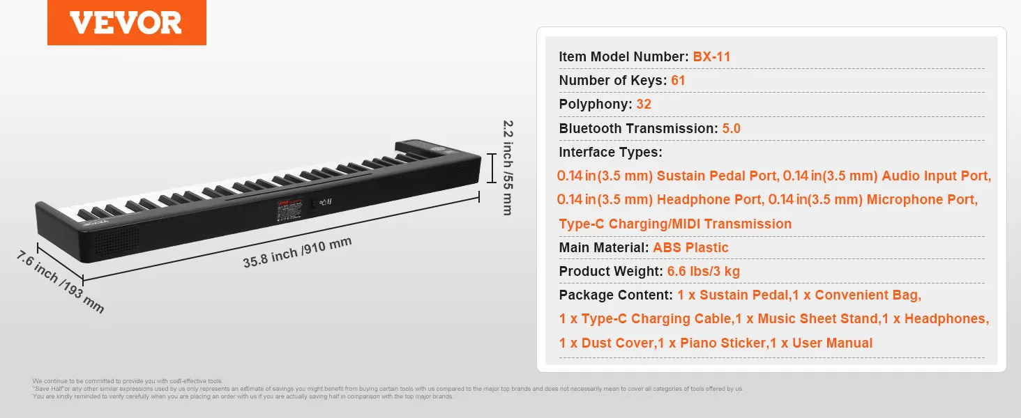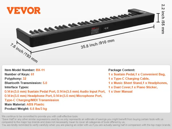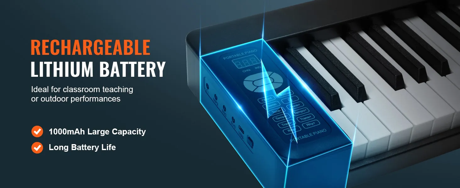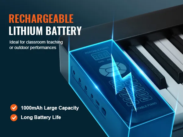 Ultraslank en opvouwbaar ontwerp: ons draagbare pianotoetsenbord met 61 toetsen heeft een ultradunne behuizing en een 180° opvouwbaar lichtgewicht ontwerp, waardoor het ongelooflijk gemakkelijk op te bergen en te vervoeren is. Met een ingebouwde oplaadbare lithiumbatterij ondersteunt hij langdurig gebruik en is hij perfect om overal mee naartoe te nemen.