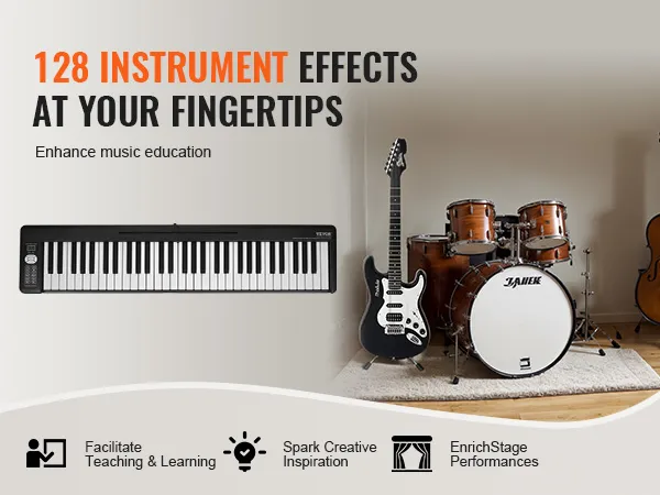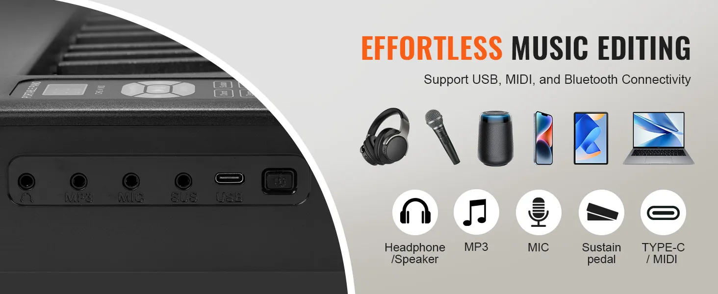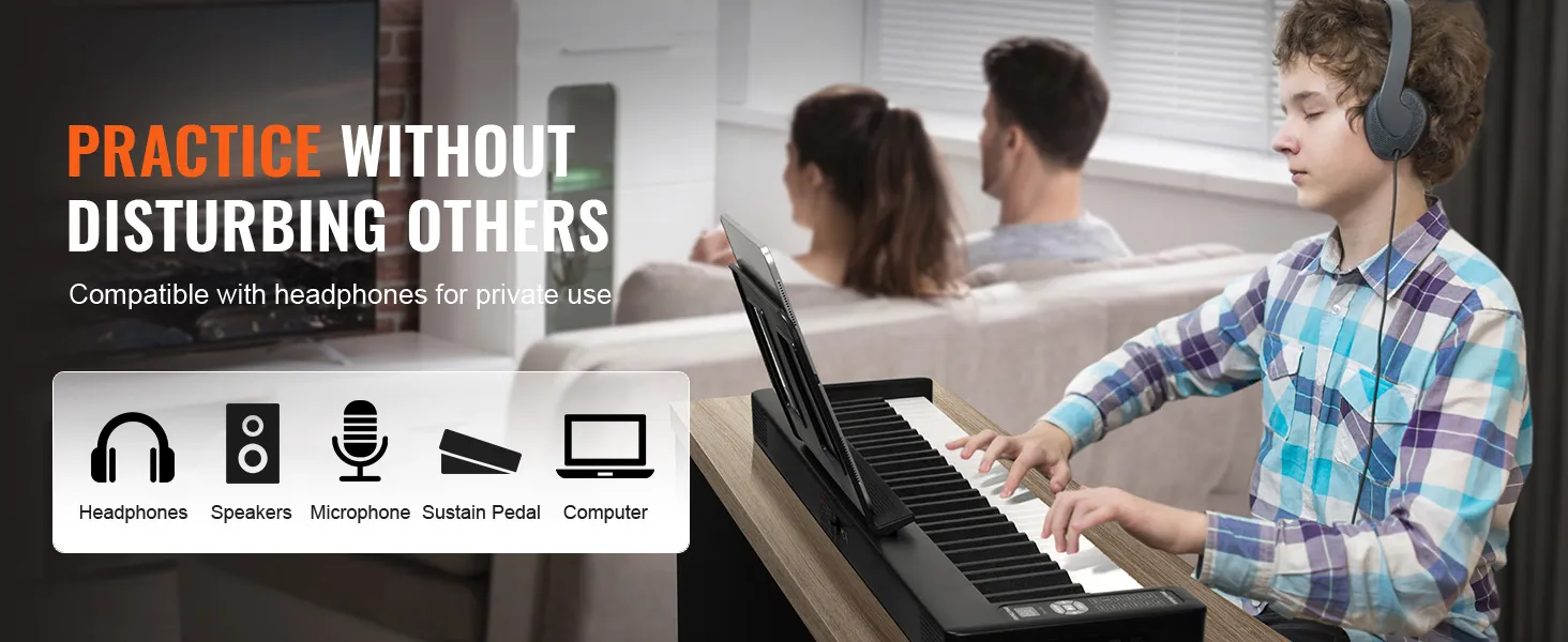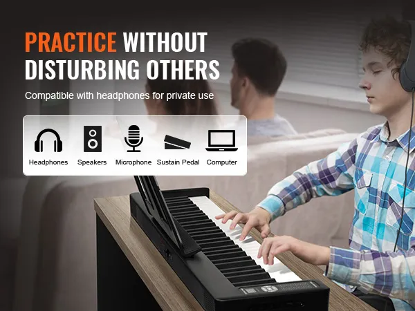 Dankzij de speciale koptelefoonaansluiting kun je oefenen met ons draagbare toetsenbord zonder anderen te storen. Bovendien kunt u dankzij de microfooningang meespelen en meezingen op een draagbaar pianotoetsenbord, waardoor uw sessies nog dynamischer en leuker worden.