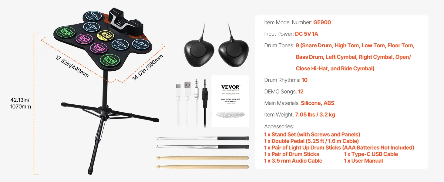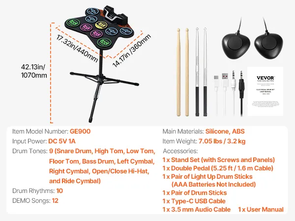 All-Inclusive Accessory Pack: Our digital drum set comes with an adjustable stand, a pair of 21-color drum sticks, wooden drum sticks, double pedals, USB cable, and audio cable. Everything your child needs to get started with drumming, ideal for ages 3+.