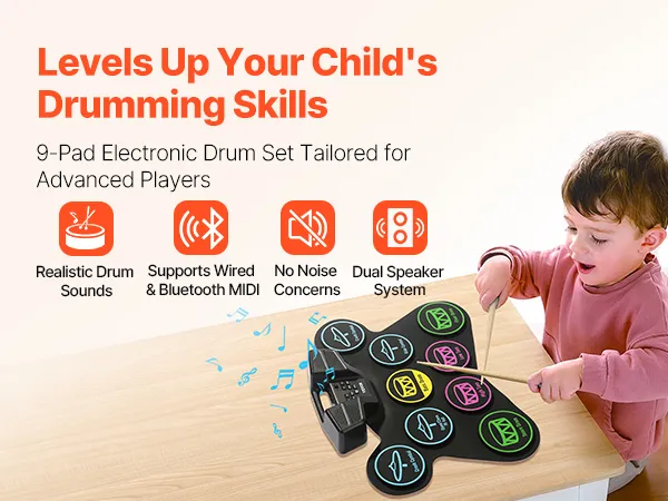 More Sound & Playing Options: Help your child master drumming with a full range of pads! Our electric drum set includes snare drum, high tom, low tom, floor tom, bass drum, left cymbal, right cymbal, open/close Hi-Hat, ride cymbal, and rimshot. Ideal for exploring different music styles and developing your kid's skills!