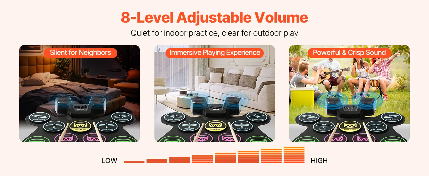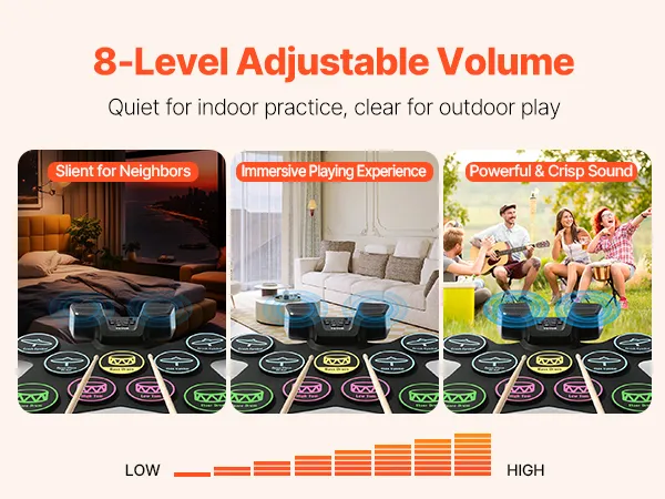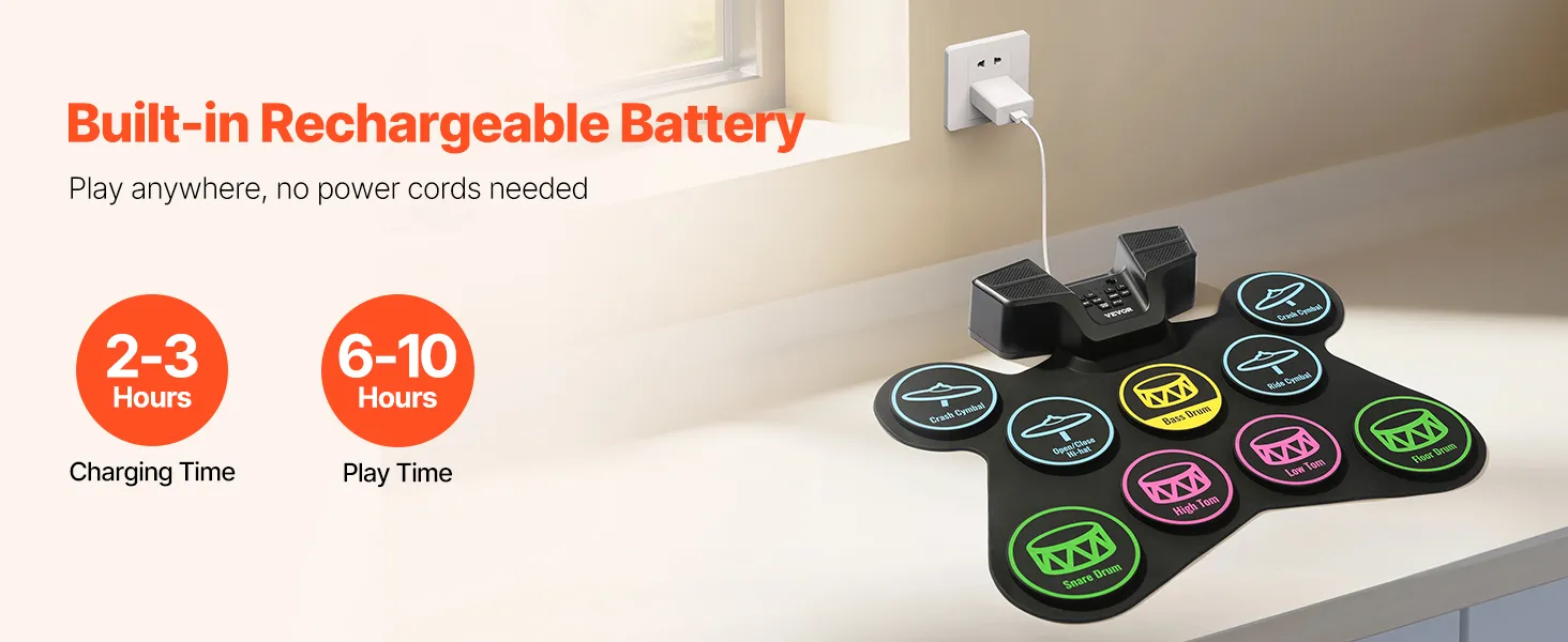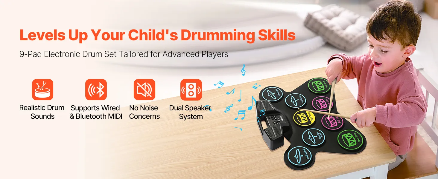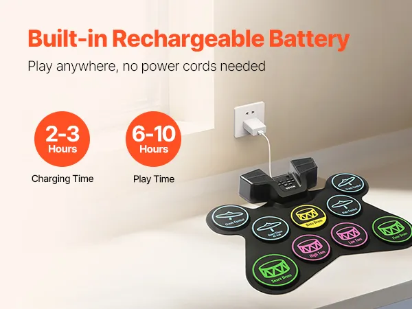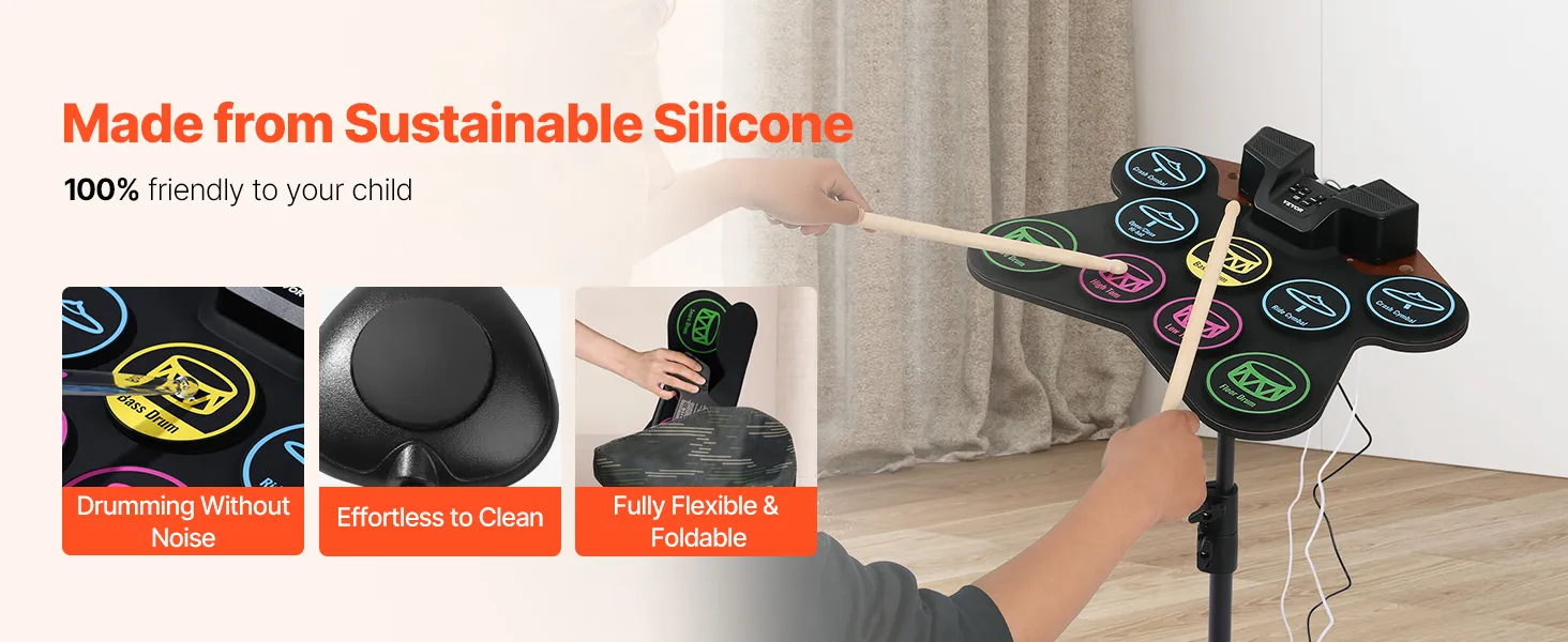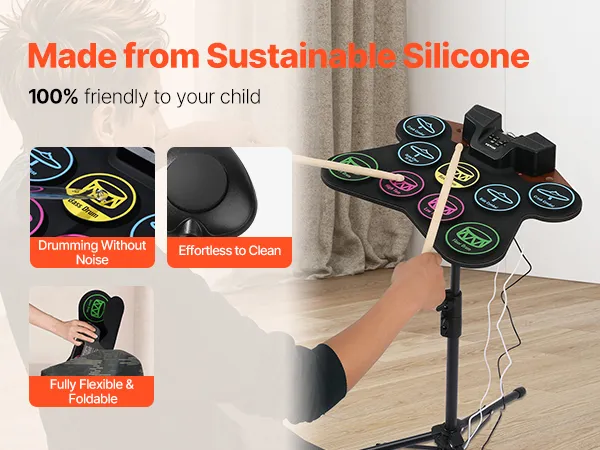 Portable & Easy to Carry: Made from sustainable silicone, the drum pads of our electronic drum set for kids are lightweight and foldable. Featuring a built-in 2000mAh rechargeable battery, it’s suitable for play in any setting, whether at home or outdoors.