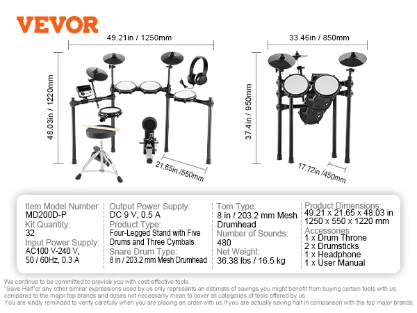 VEVOR Electric Drum Set, 32 Drum Kits & 480 Sounds Electronic Drum Kit, USB MIDI Supported 8 in Quiet Mesh Snare Electric Drum Set with 10 in Cymbals Drum Sticks & Headphone, for Beginners & Adults