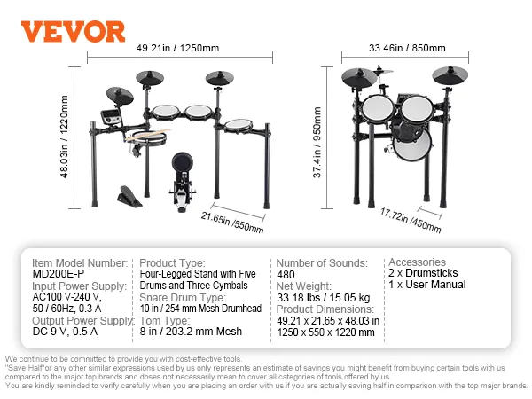 VEVOR Electric Drum Set, 32 Drum Kits & 480 Sounds Electronic Drum Kit, USB MIDI Supported 10 in Quiet Mesh Snare Electric Drum Set with 10 in Cymbals Drum Sticks & Pedals, for Beginners & Adults