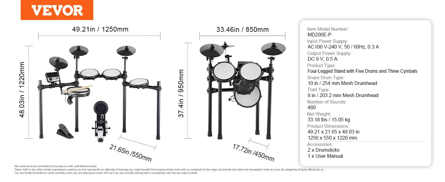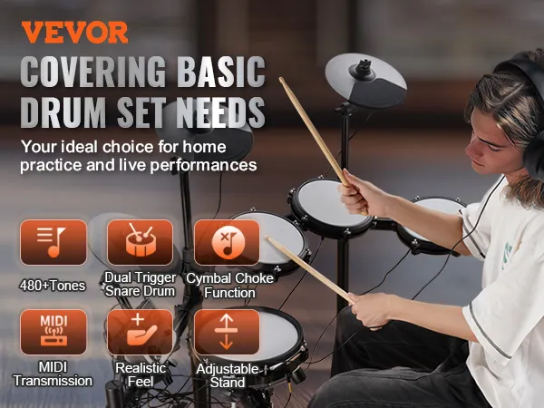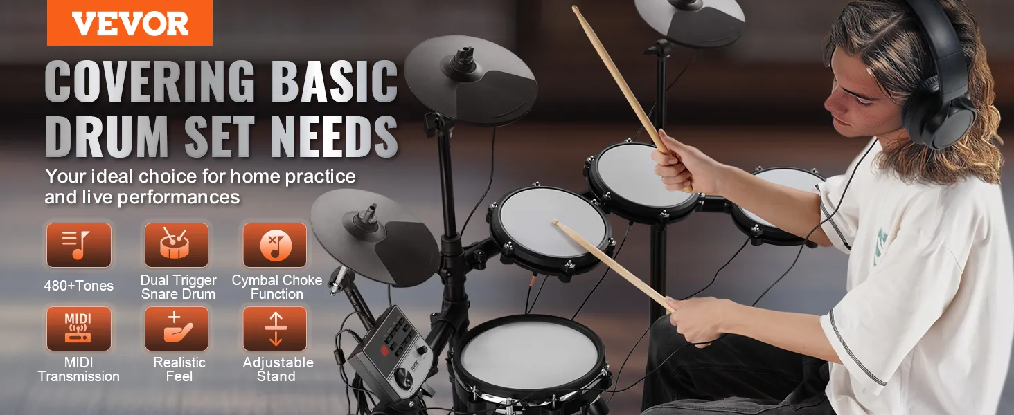 Our electric drum set has over 480+ sounds for diverse styles. MIDI support makes recording and composing a breeze. You'll have everything you need with a dual-trigger snare and crash cymbal mute. Plus, the sturdy adjustable stand fits players of all levels.