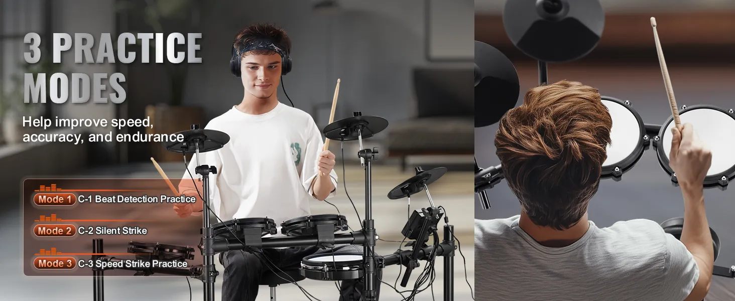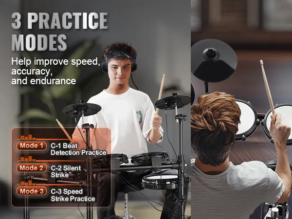Boost your skills with three modes: C-1 for beat detection, C-2 for silent playing, and C-3 for speed practice. Enhance your speed, accuracy, and endurance in every practice session!
