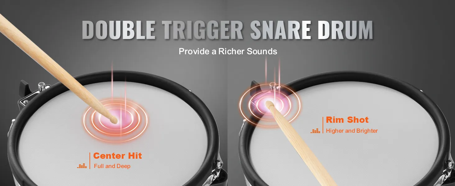 Authentic Playing Feel: This electric drum kit simulates real percussion instruments with a dual-trigger snare, allowing you to practice edge-playing techniques while enjoying various sounds. The crash cymbal mute function further enhances beginners' drumming skills, making it easier to master rhythm and technique.