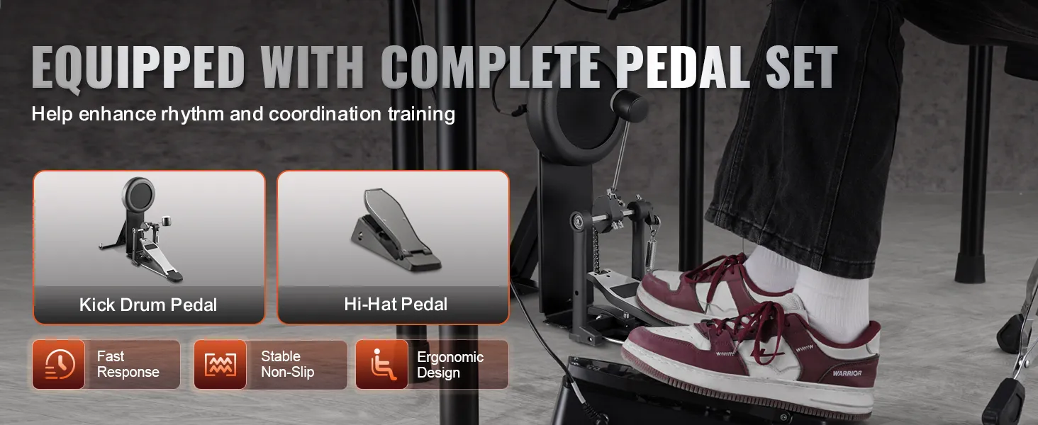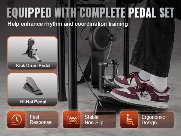 The hi-hat and kick drum pedals are designed for quick response and solid grip, ensuring stability during your performance. Enjoy comfort during long practice sessions with our ergonomic design.