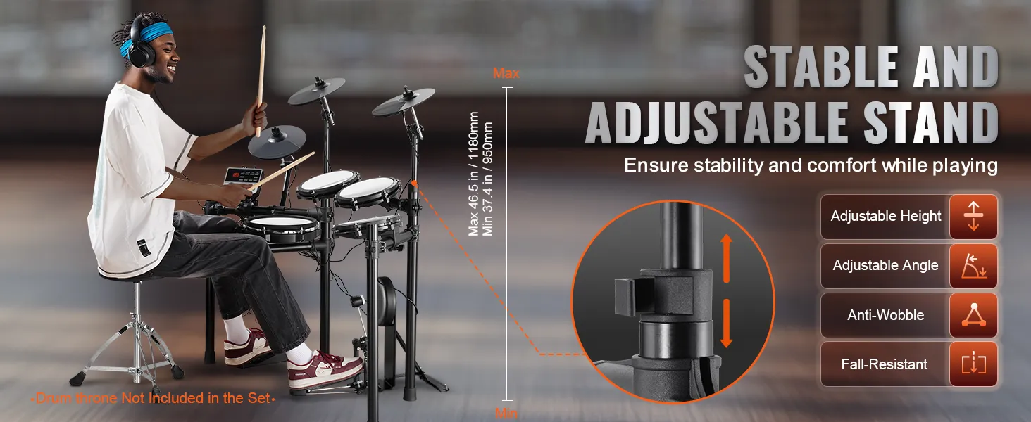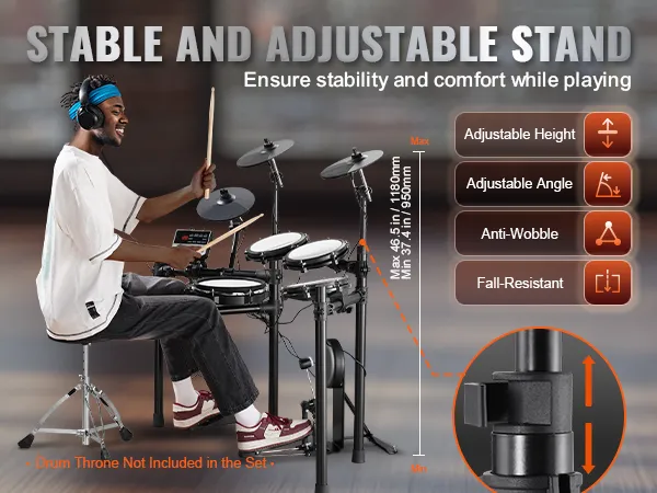 The adjustable stand allows you to customize the height and angle to suit your playing style. Its robust structure ensures your drum set stays steady, even during intense sessions, so that you can concentrate on your playing.