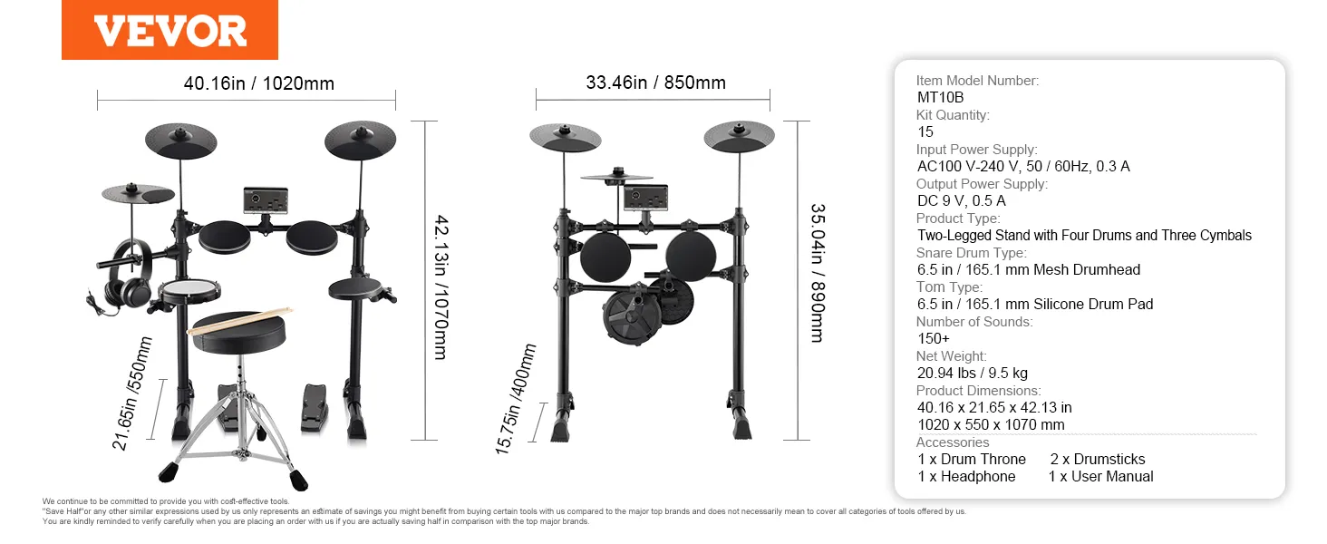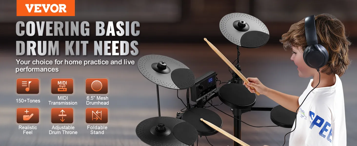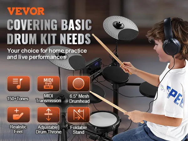 VEVOR Electric Drum Set, 15 Drum Kits & 150 Sounds Electronic Drum Kit, USB MIDI Supported 6.5 in Quiet Mesh Snare Electric Drum Set with 10 in Cymbals Drum Sticks & Headphone, for Beginners & Adults
