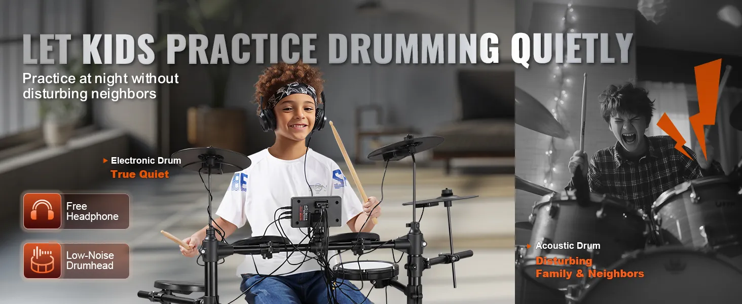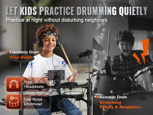 Complete Drum Kit: This electric drum set includes four 6.5" drums and three 10" cymbals, giving you an entire striking area. The drum module, sticks, and pedals are included, plus headphones and an adjustable throne. It's ideal for beginners and rhythm training!