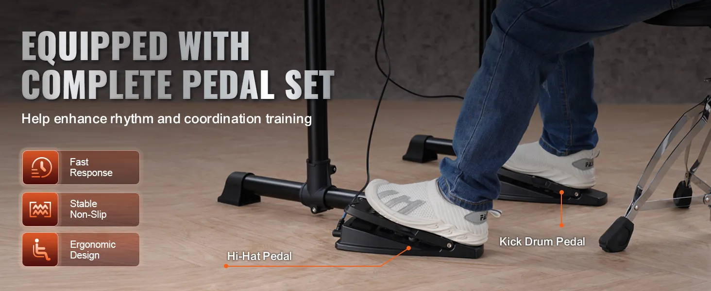 The hi-hat and kick drum pedals are designed for quick response and solid grip, ensuring stability during your performance. Enjoy comfort during long practice sessions with our ergonomic design.