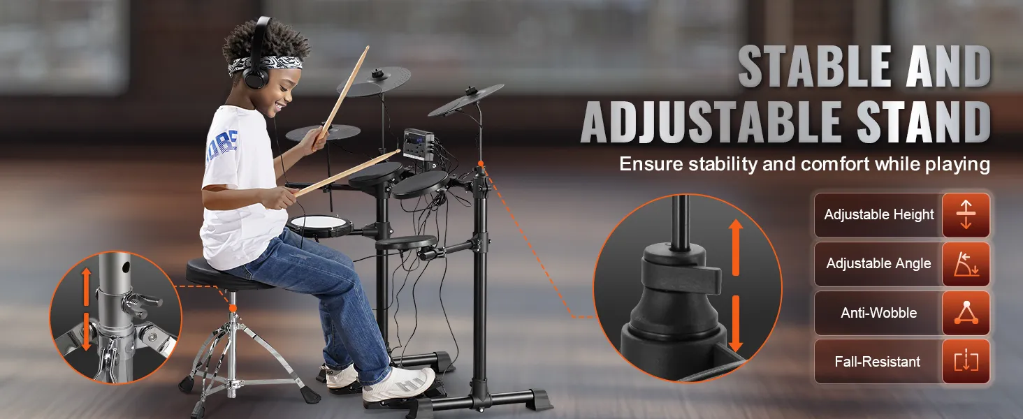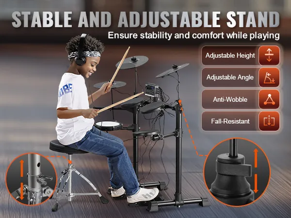 Adjustable for Every Player: The flexible stand lets you customize the height and angle for comfortable playing. Plus, this electric drum set is portable and folds up easily for storage or gigs. The breathable, adjustable drum throne keeps you comfortable while you play!