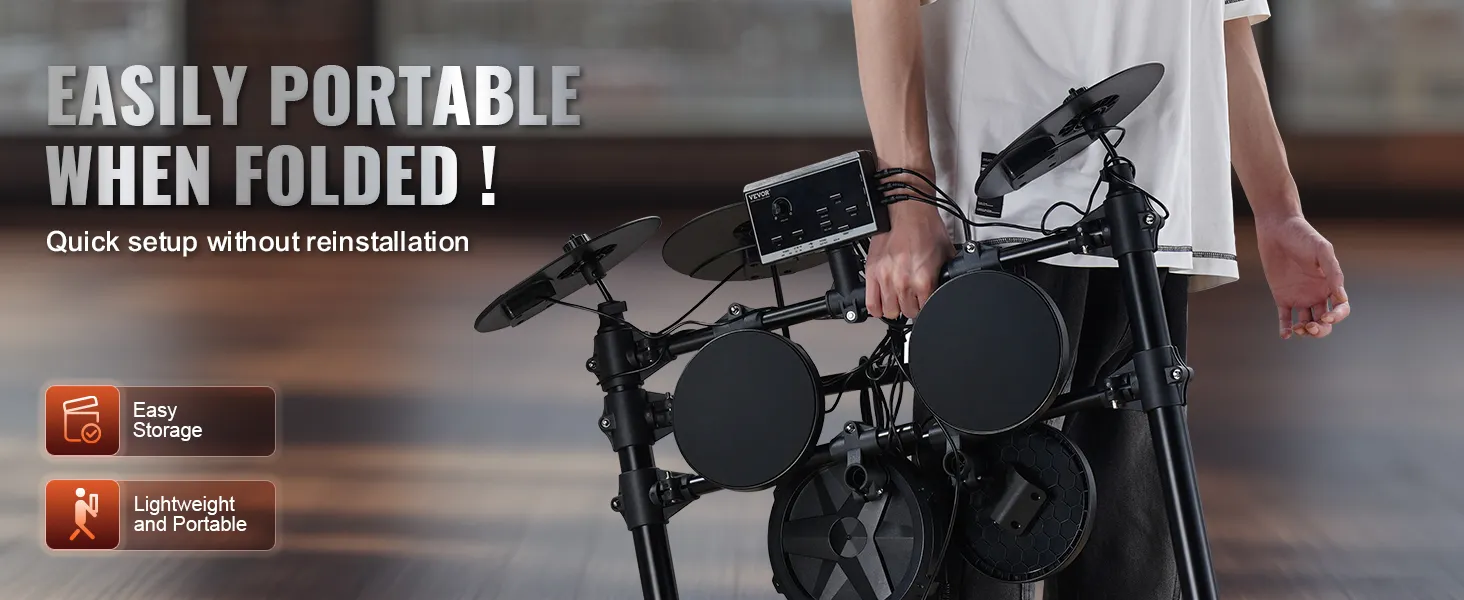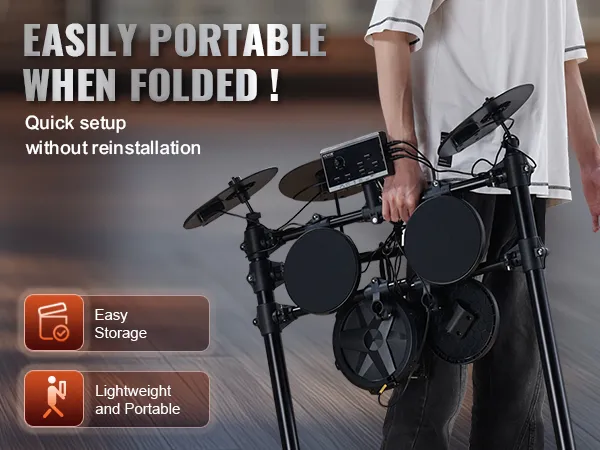 This electronic drum set folds up quickly, making it simple to set up at home, in the studio, or on stage - no reassembly needed! Save time and jump right into drumming wherever you are.