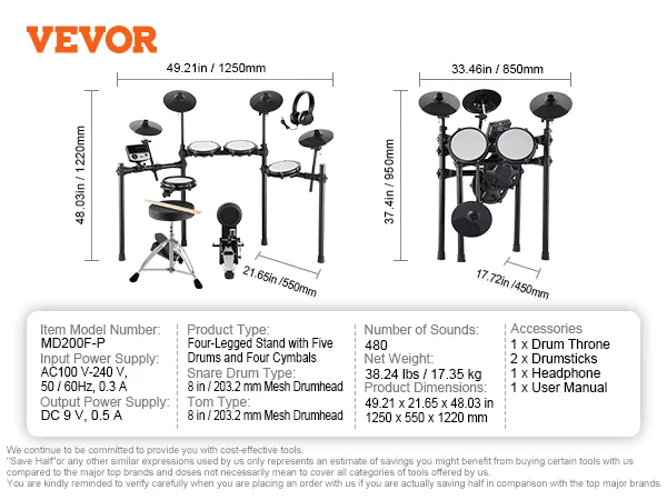 VEVOR elektronische drumset, 32 drumkits en 480 geluiden Elektronische drumkit, USB MIDI-ondersteund 203,2 mm Dual-Trigger Snare elektronische drumset met 254 mm bekkens, drumstokken en koptelefoon, elektronische drums