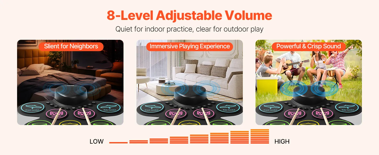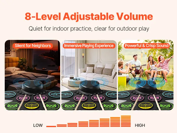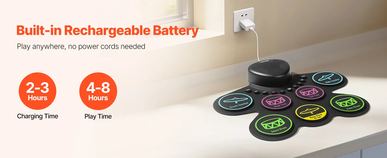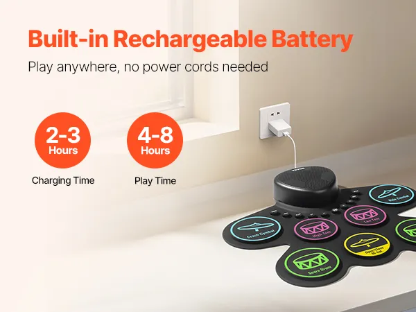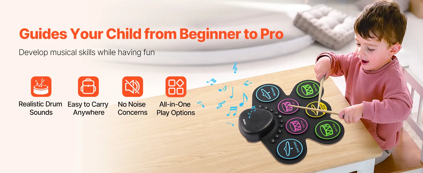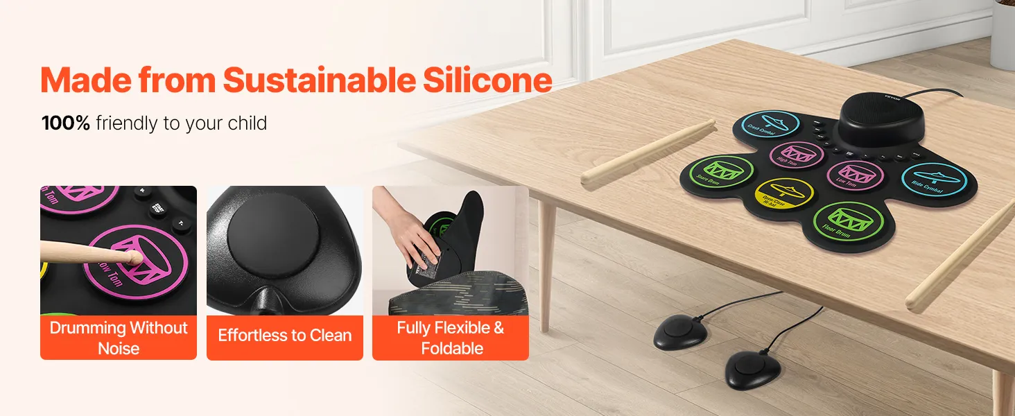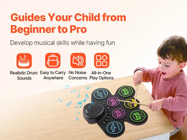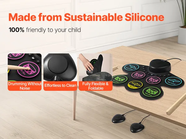 Portable & Easy to Carry: Made from sustainable silicone, the drum pads of our electronic drum set for kids are lightweight and foldable. Featuring a built-in 1000mAh rechargeable battery, it’s suitable for play in any setting, whether at home or outdoors.
