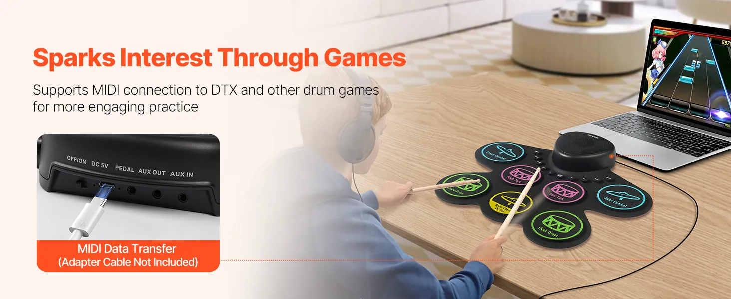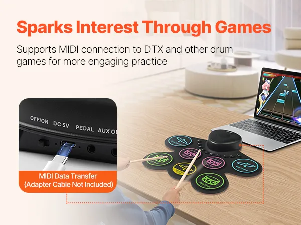 With MIDI support, our kids electric drum set can easily connect to computer or other devices. So that kids can use various music software for interactive learning, making practice more exciting and engaging.