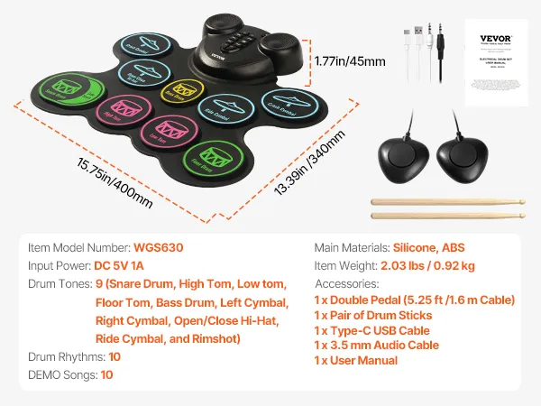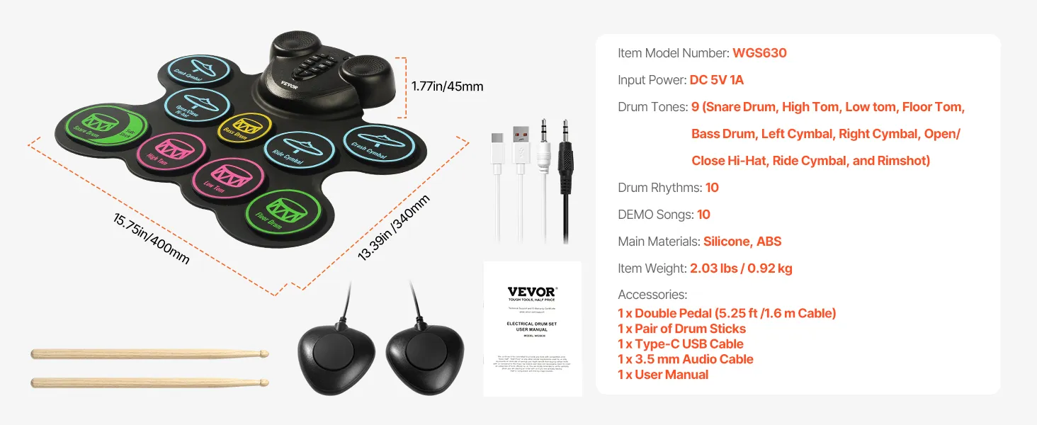 All-Inclusive Accessory Pack: Our digital drum set comes with dual foot pedals, a USB cable, an audio cable, and a pair of drum sticks. Ready to use straight out of the box and ideal for kids aged 3+ to start learning.
