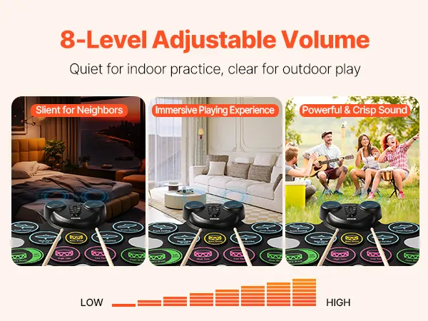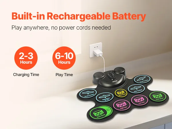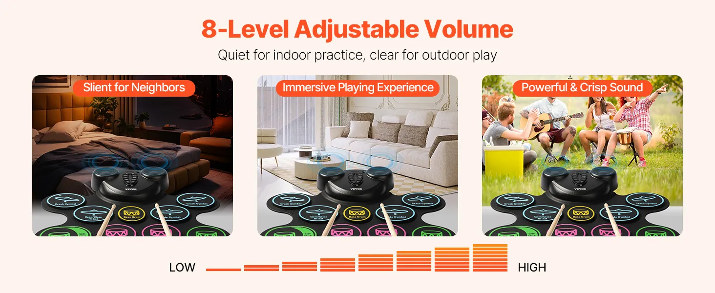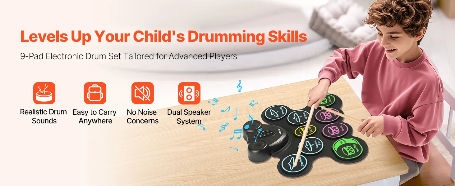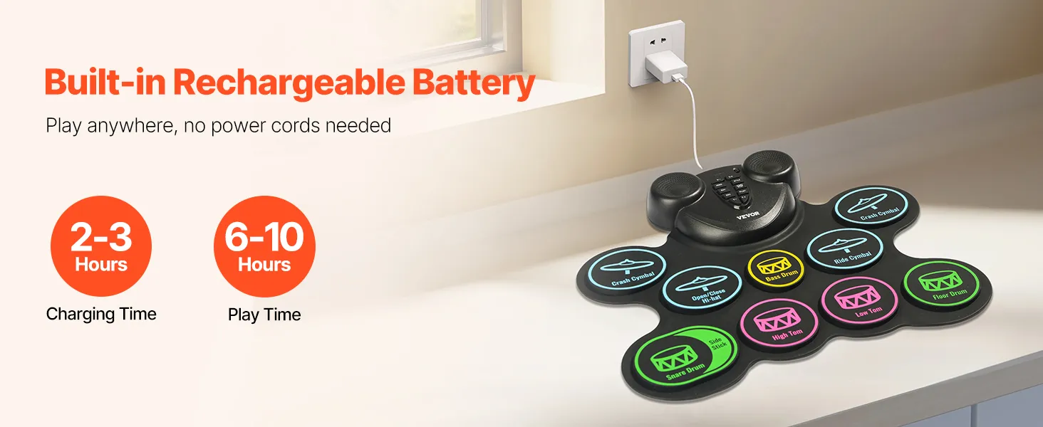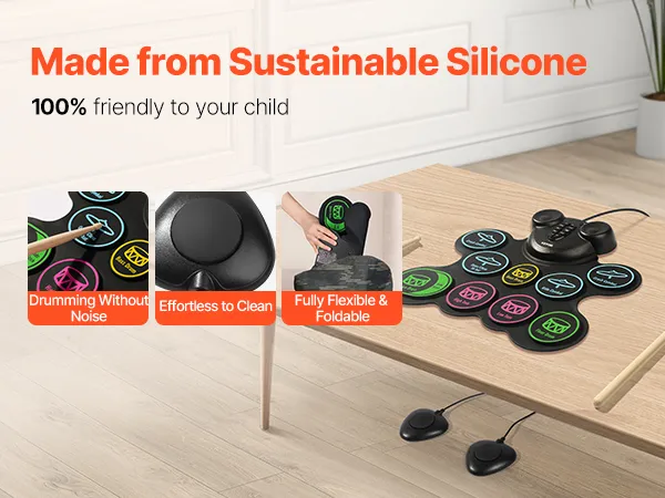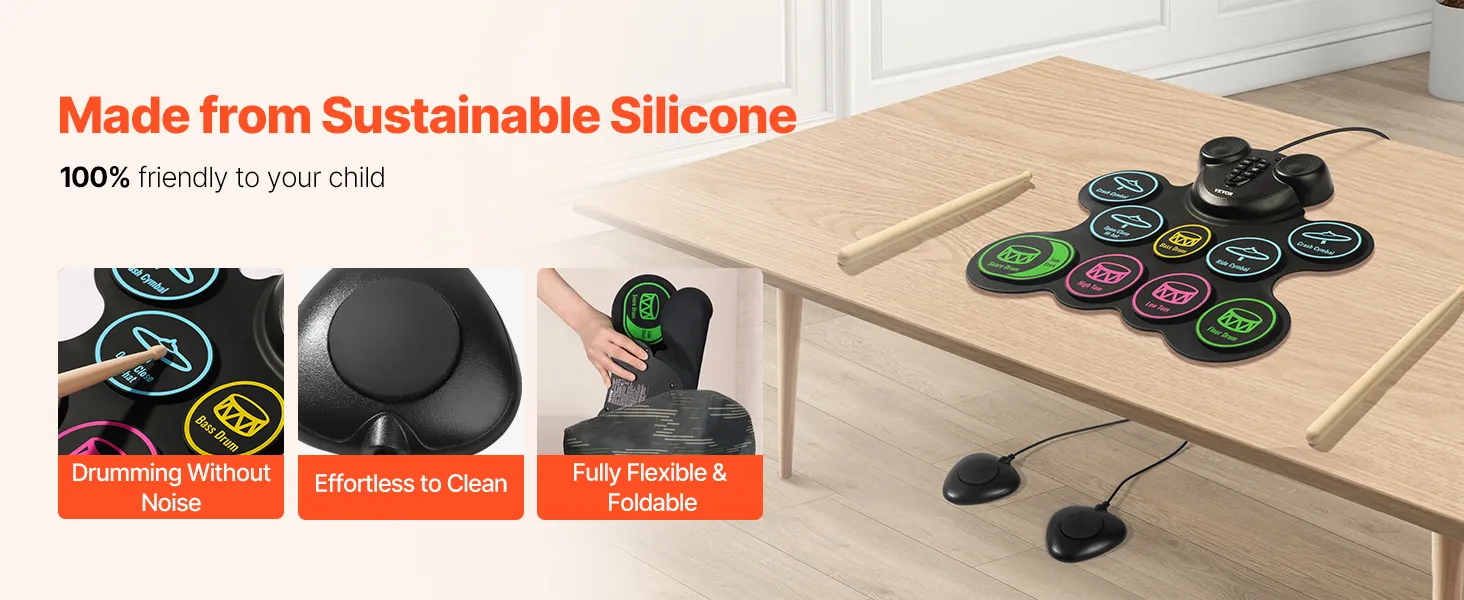 Portable & Easy to Carry: Made from sustainable silicone, the drum pads of our electronic drum set for kids are lightweight and foldable. Featuring a built-in 2000mAh rechargeable battery, it’s suitable for play in any setting, whether at home or outdoors.